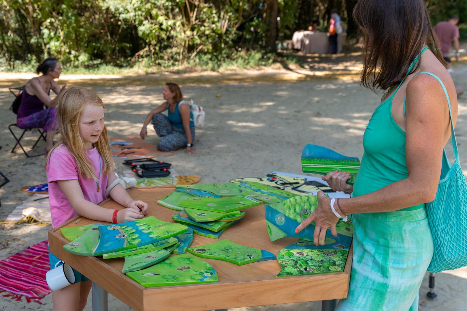 Olyan az egész rendezvény, mint a béke szigete. A tó partjára puha homokot terítettek szét, a vízben gyerekek, felnőttek, kutyák hűsítik magukat. Lázár Péter drámapedagógus köré érdeklődők gyűlnek, a földön óriás társasjáték, textillovacskákkal lehet a következő mezőre lépni. Aki jó ötletet tud mondani, hogy miért érdemes a birtokunkon vizes élőhelyet kialakítani, fabatkát kap. Egy fiatal nő angolra fordít mindent a mellette ülőnek, a játéktáblára kiskacsa totyog be, bogarászik, uborkahéjat talál, megörül neki. Odébb Varga Rita építészmérnök egy falon dolgozik, és közben a sgraffitotechnikát magyarázza. Otthon is megpróbálhatjuk, ő inkább belső térbe javasolja. Több különböző színű réteget kell egymásra felvinni, majd száradás után visszakaparni a tetszőleges mélységig, attól függően, melyik felületet szeretnénk láttatni. Az anyag vályogglett, azaz agyag, homok és kőpor, teljesen környezetbarát, és még a hulladéka is újrahasználható. A gyakorlás céljából felhúzott házikó másik sarkánál egy török lány tapasztja a falat vályoggal, kézzel simítja fel a lágy anyagot. Isztambulban tanul építészetet, egy magyar ismerősétől hallott a találkozóról, nagyon érdeklik ezek a technikák, szerette volna kipróbálni, meséli szép angolsággal.