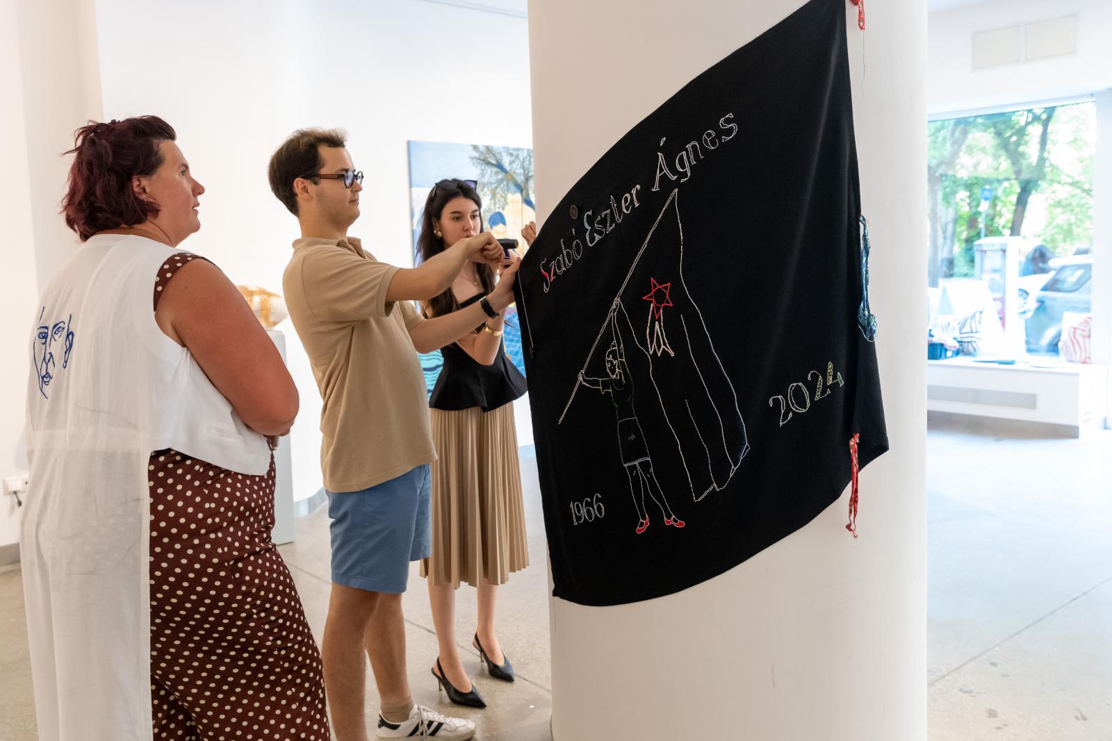 – Én évek óta jövök ezekre az alkalmakra, mindig is szerettem a közösségformáló eseményeket, ahol igazi emberek vannak, igazi érzésekkel. Ez egy átmentés is, egy eltűnő világot őrzünk meg. Régről ismertem Esztert, a képzőművészeti egyetemen egy évfolyamra jártunk, és már akkoriban is rengeteg közös programot szerveztünk. A gyász sosem múlik el, de itt körbe tudja nőni kicsit az élet. Fontos, hogy örömmel vegyüljünk, s közben kicsit meg is idézzük őt – meséli az Edinaként bemutatkozó résztvevő, miközben az almát hámozza. Minden rész hasznosul, az alma húsából lekvár, a lehullott részekből nagy üvegekben ecet készül. A galéria falán egy polcon sorakoznak a korábbi évek lekvárjai – köztük a Covid alatt cukor helyett fekete sóban eltett gyümölcs –, s mellettük kis üvegben az ecetek, akár az élet édes oldala mellől elmaradhatatlan savas.