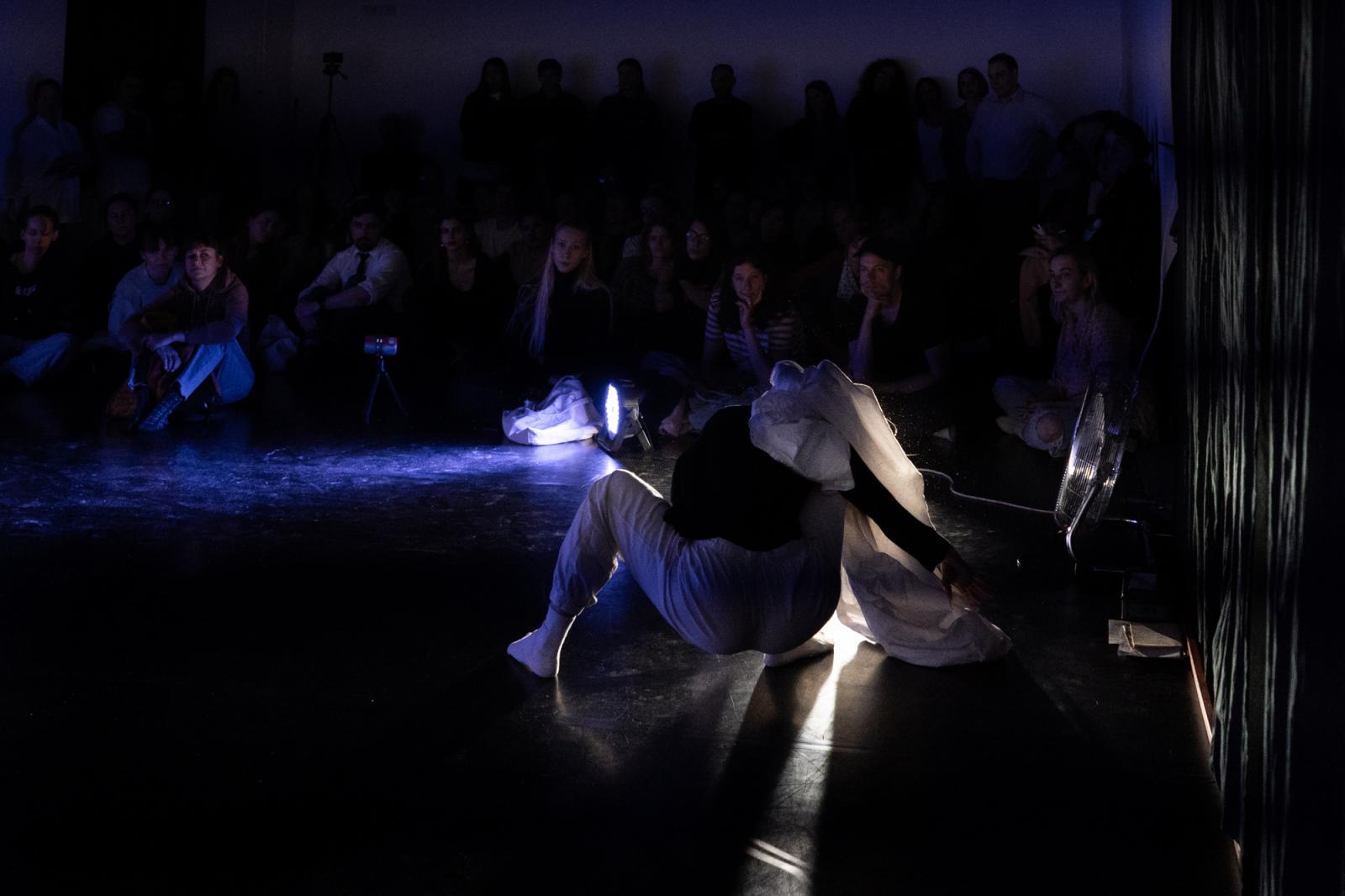 Ők mindketten a szervezőként működő Engedetlenség Leányiskolája (School of Disobedience) kilenc hónapon át futó mesterkurzusának résztvevői – ez egy nomád iskola, ahol az oktatás angol nyelven folyik, magyar és külföldi vendégelőadók által. Ádám Anna előadó- és képzőművész, a Gray Box társulat koreográfusa, tíz évvel ezelőtt kezdte felépíteni a képzési modellt (melyről tavaly decemberben mesélt a Visszhangnak), hogy létrehozzon egy párhuzamos, választott valóságot, egy szigetet, olyan szakmai és emberi értékek mentén, amelyekben hisz és amiket hiányol, úgymint bátorság, őszinteség, nagylelkűség. A számos futó programjuk (köztük bárki számára nyitott foglalkozások, események) közül az egyik legkedvesebb számukra a performansz-est, mert itt valóban megjelenik a sebezhetőség és a kockázatvállalás. „Egyszerű, őszinte és nagylelkű” – mint a házigazdák jellemezték az estet, hangsúlyozva, hogy ehhez közös feladatunk a biztonságos tér megteremtése, amelyben mindenki komfortosan érezheti magát.