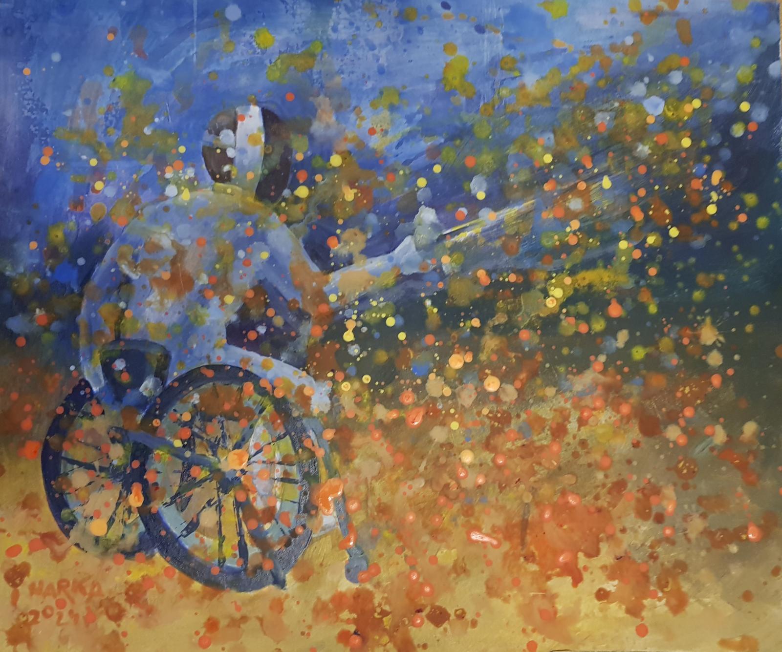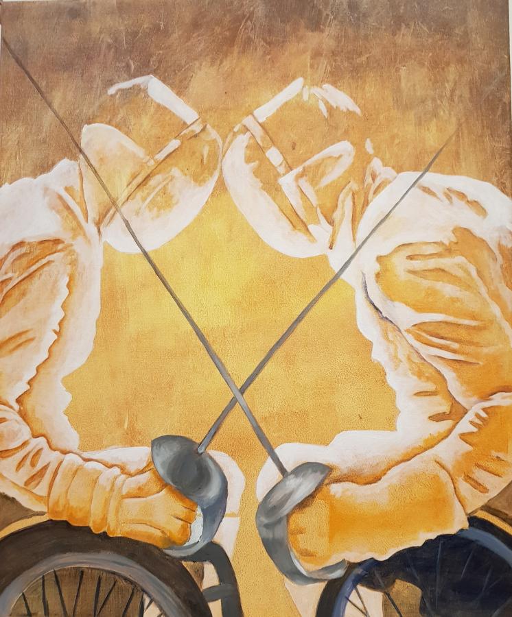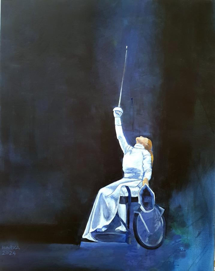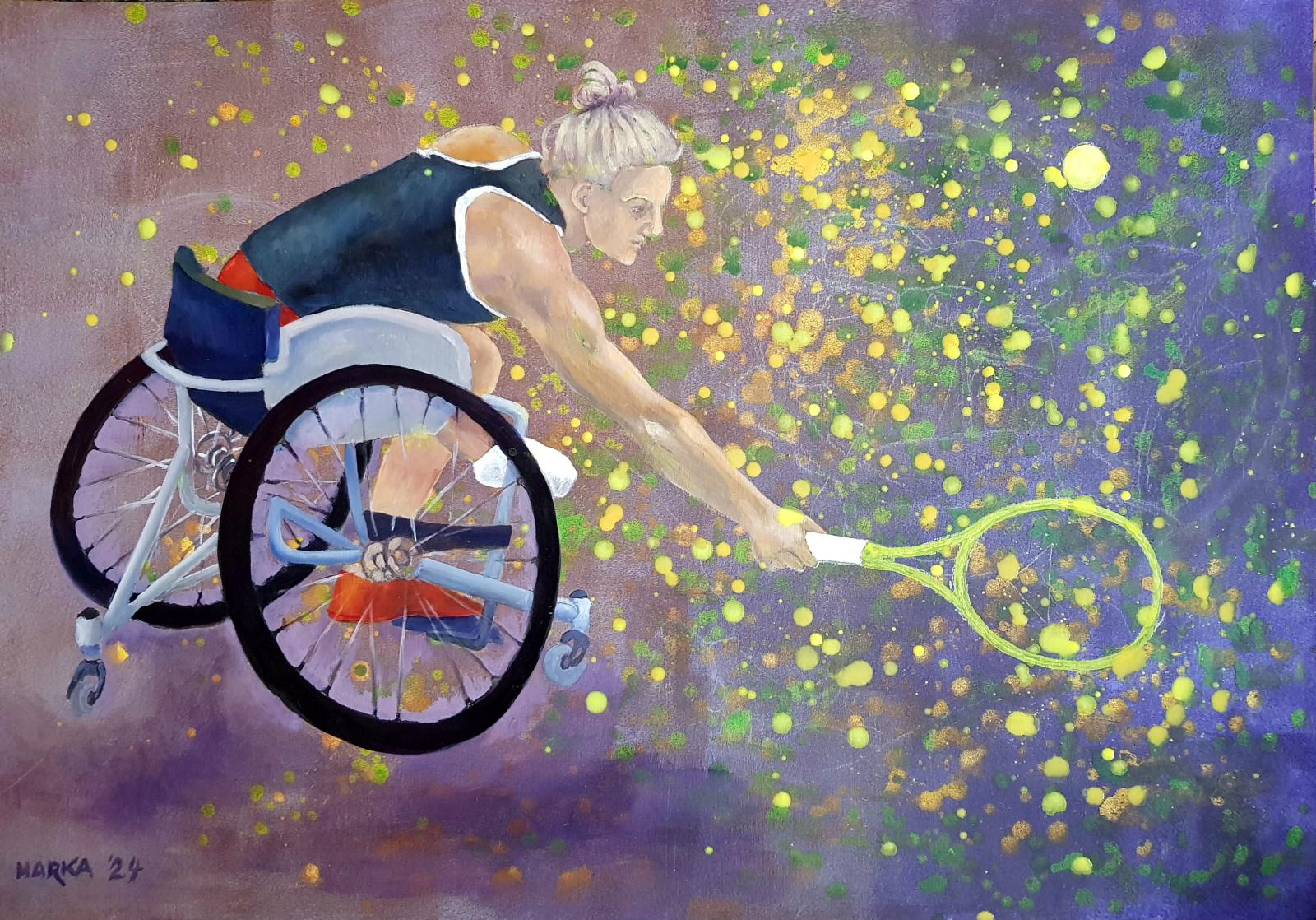 Nála is szépen megférnek egymás mellett a falon a régi, klasszicizáló családi festmények és a színpompás kortárs művek. Köztük azok a portrék, amiket kerekesszékes sportolókról festett. „A környékén volt egy faültetés, ahol rengeteg, fogyatékkal élő ember gyűlt össze.