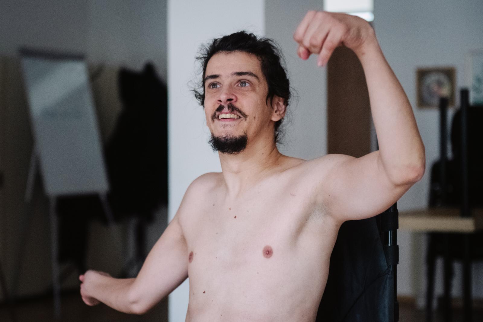 – Ez az első olyan munkám, ahol nem inkluzívan táncolunk. Adrinak van egy külső rálátása, nem feltétlenül azt kéri, ami nekem komfortos, vagy amit én szeretnék csinálni, hanem határozottan kiáll, hogy „jó lenne, ha ezt megcsinálnád, Karcsi”. Jobban kibillent a komfortzónámból, mint akikkel eddig táncoltam, és mindig tanulok tőle. Olyan improvizációs technikákat is, amikbe kevesebbszer tudunk belemenni az Artman Egyesületben, ahová még régen egy barátom hívott el, és azóta is együttműködöm velük. Nagyon imádom az Artman működését, de ott kialakult csoportfolyamatok vannak.