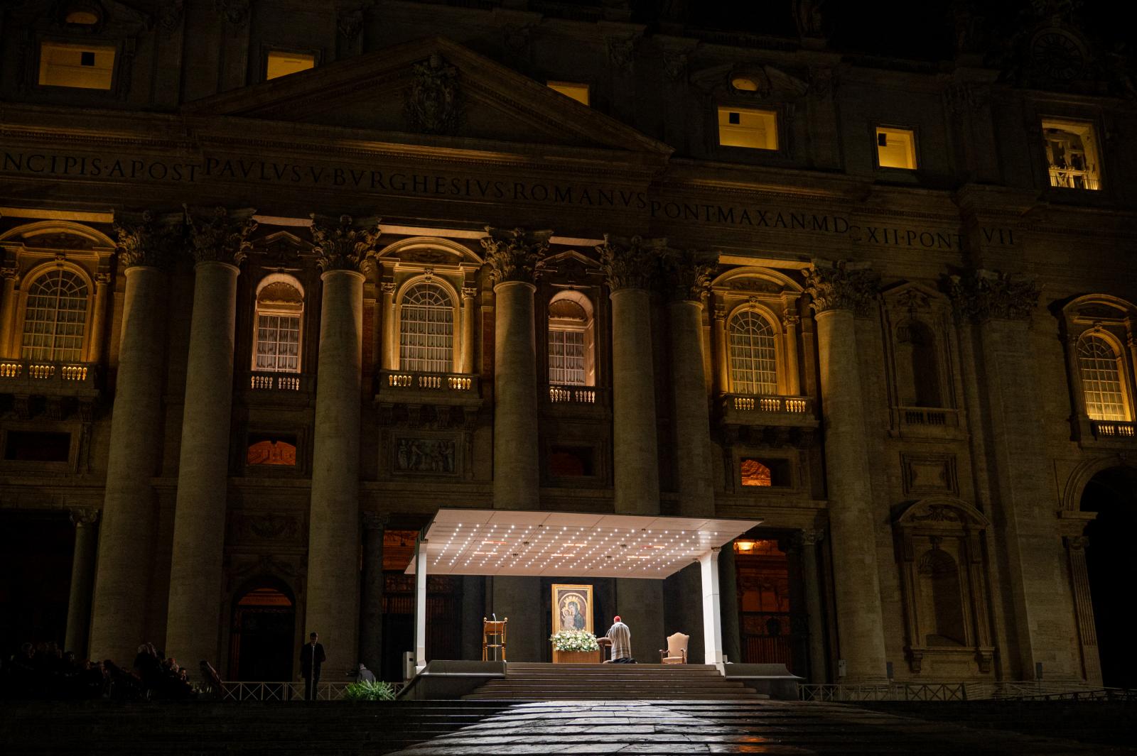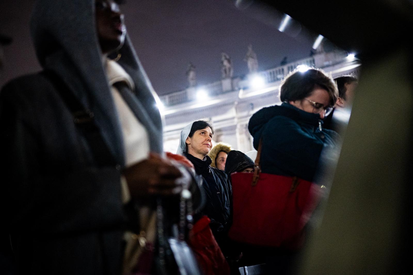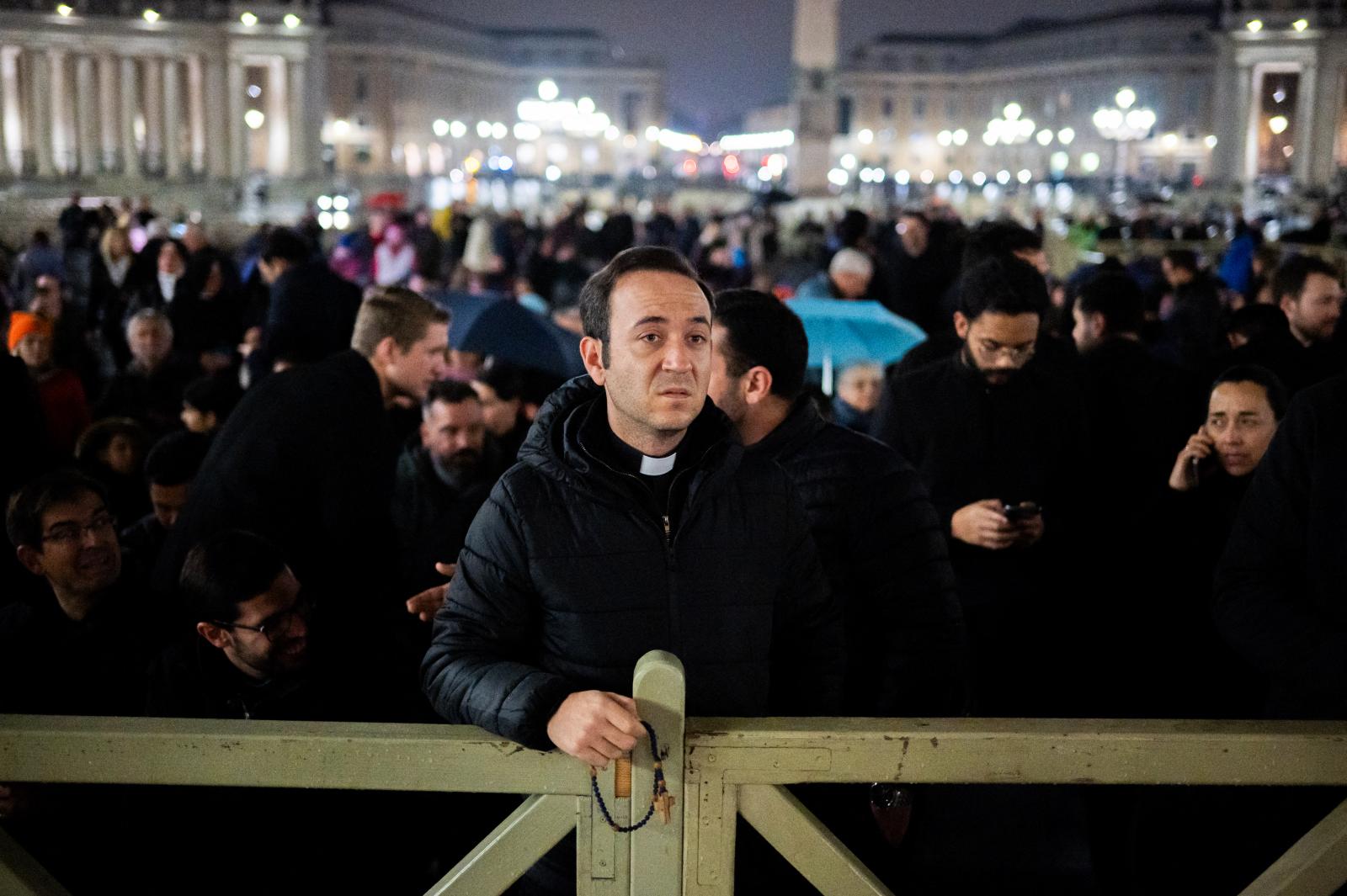 A rózsafüzér imát a katolikus egyházfő gyógyulásáért mondták. A bazilika előtt hétfő este legalább tízezer ember gyűlt össze. Ferenc pápa február közepén légzési nehézségek miatt került kórházba.