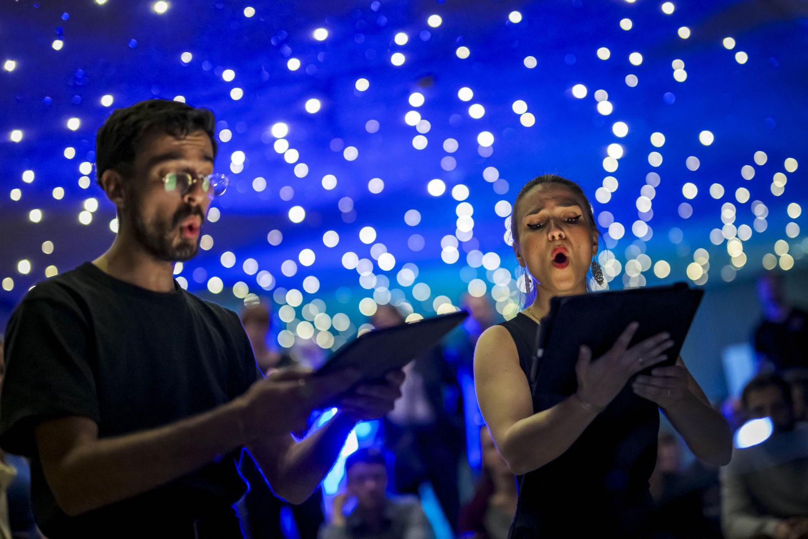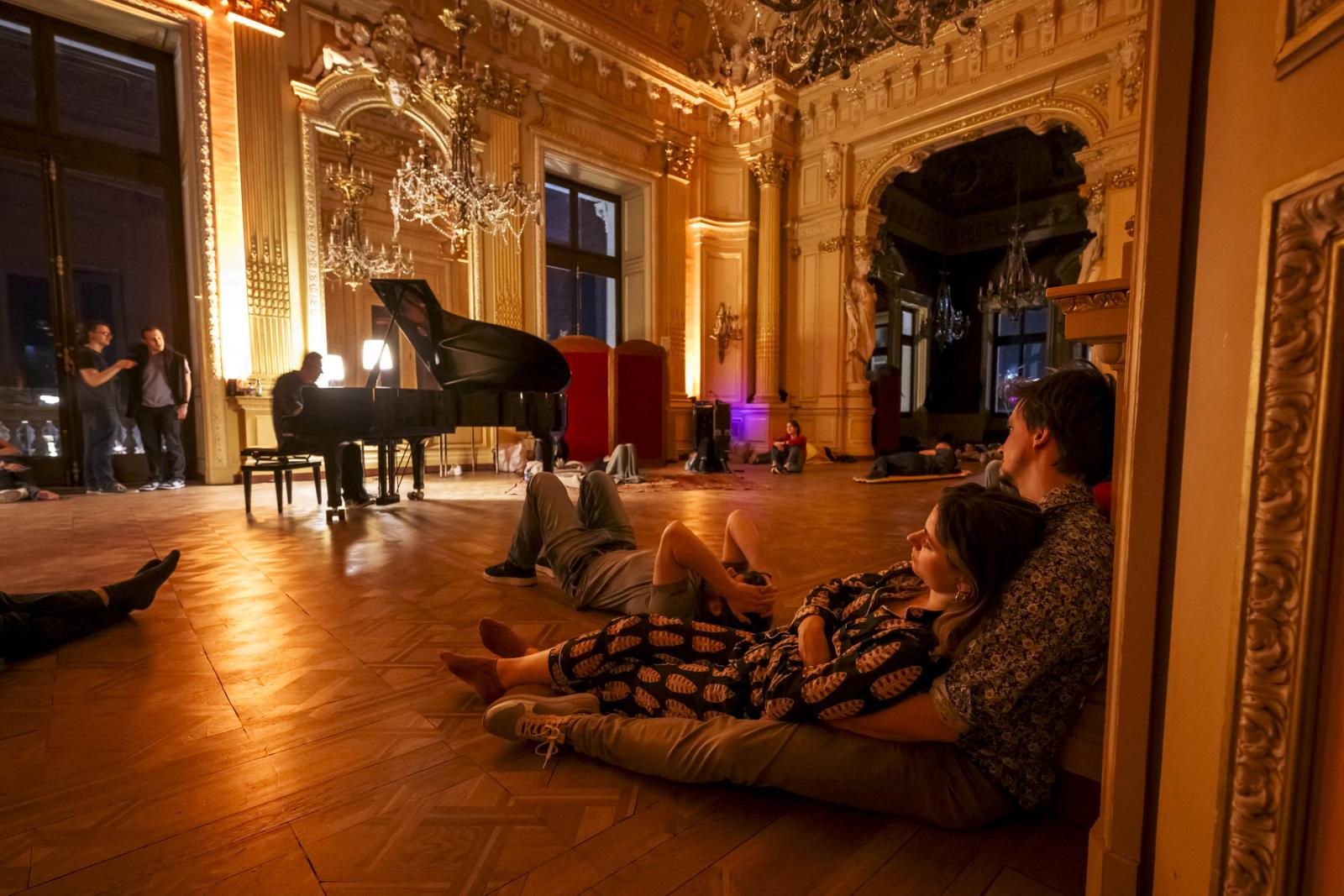 A Grand Théâtre de Genève, melyet 1876-ban avattak fel, az idén április 11-én pénteken este 8-kor nyitotta meg kapuit a látogatók előtt, akik a nimfákat és angyalokat ábrázoló freskókkal, hatalmas tükrökkel és csillárokkal teli, csillagos égként kivilágított színházteremben hallgathatták a tiszteletükre játszott kis éji zenét: Marino Formenti olasz zongorista Chopintől a Pink Floydig számos népszerű darabot adott elő. Végül jött a szundítás, bársonyszékben, páholyban és felfújható matracokon.