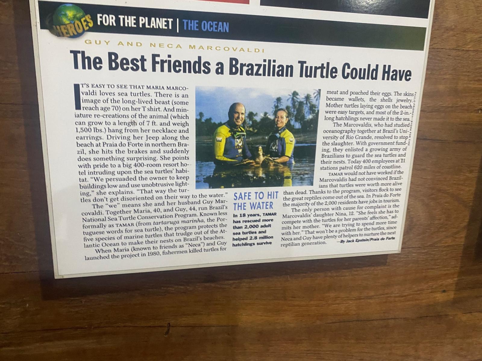 Az egyik teknős például a fajától eltérő színű páncéllal született valamilyen genetikai rendellenesség miatt, a természetben pedig halálra lenne ítélve. Egy másik halászhálókba akadt és a hajótestnek ütközve megrepedt a páncélzata. Ha a halászok nem hívták volna a szervezet munkatársait, valószínűleg elpusztult volna. Ehelyett medencékben körözve tanítanak. Például minket, európaiakat is, akik tengeri teknősöket nem gyakran látnak, és csak a szerencsének köszönhetően lyukadtak ki Brazíliában, meg persze a helyieket is.