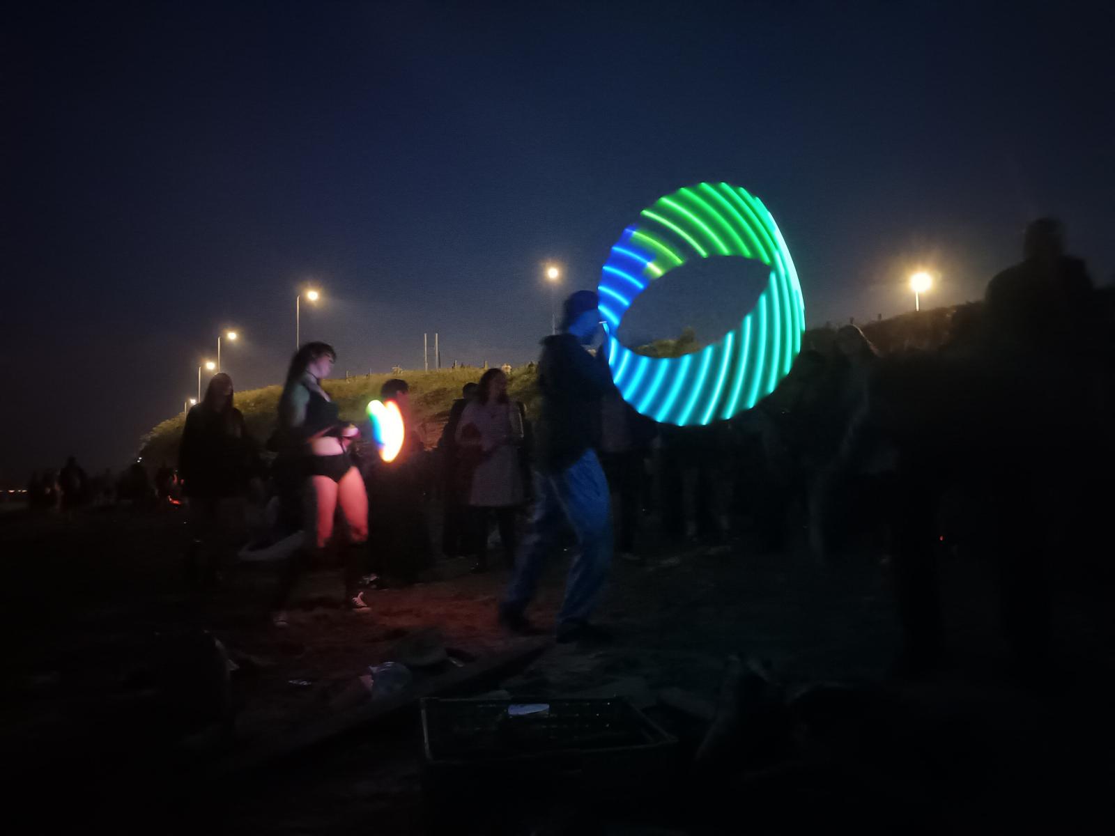 A fesztivál késő délután zárja a kapuit, hazavonulunk és felkészítjük a csapatainkat az estére. Ritka pillanatok egyike, hogy a párommal együtt tudunk szórakozni. A gyerekek barátai átjönnek aludni, nincs ránk szükség, így elvonulhatunk a tengerparti programra. Minden évben ezen a napon, amikor a leghosszabb a nappal Skóciában, mindig hatalmas népünnepély van Portobellón. Végig a parton rengeteg kis buli sorjáz, tüzek, zsonglőrök. Találkozunk vagy tíz barátunkkal, lengyelek, skótok, és vonulunk. Minden ragyog, emberek tömegei nézik az égboltot. Több száz tűz lobog, vannak, akik raklapokból építenek máglyát. Az egyik öböl felől ütemes zene csapja meg a fülünk, egy több ezres rave bulira bukkanunk. Azt hiszem, több évtizedes tapasztalattal mondhatom, hogy a legjobb bulik a spontán bulik, amelyekre nem készülünk fel, ahol nincs elvárás. A fesztiválok alapvetően ott vannak elszabva, hogy már semmilyen fényjáték, vagy zene nem tudja a profitorientáltságot elleplezni, de az ilyen pici bulikban, még megvan az, amit a kilencvenes években éltem át, amikor ott lehettem a magyar elektronikus zene születésénél.