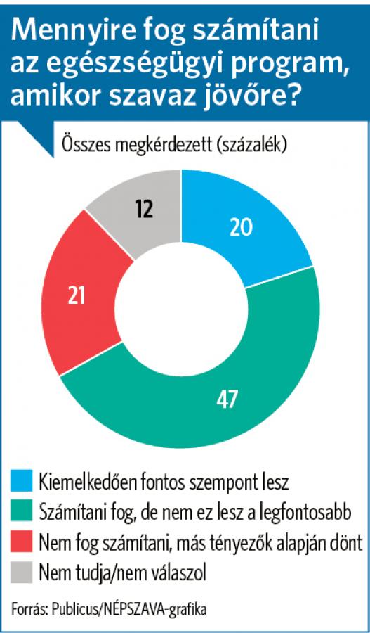 E mellett a polgárok ötöde (21 százalék) számára ez a téma érdektelen, ők már most tudják, hogy más szempontok alapján fognak dönteni. A demográfiai bontás itt nem mutat feloldhatatlan véleménykülönbségeket, ám a politikai alapállás igencsak megosztja szavazókat. Míg a kormánypártiak csupán hatodának (16 százalék) kulcskérdés a választottjának egészségügyi programja, addig az ellenzékiek több mint harmadának (36 százalék). Az ágazat jövő iránt közömbösen voksolók aránya éppen fordított: a kormányoldalon 32 százalék, az ellenzékin 17 százalék.