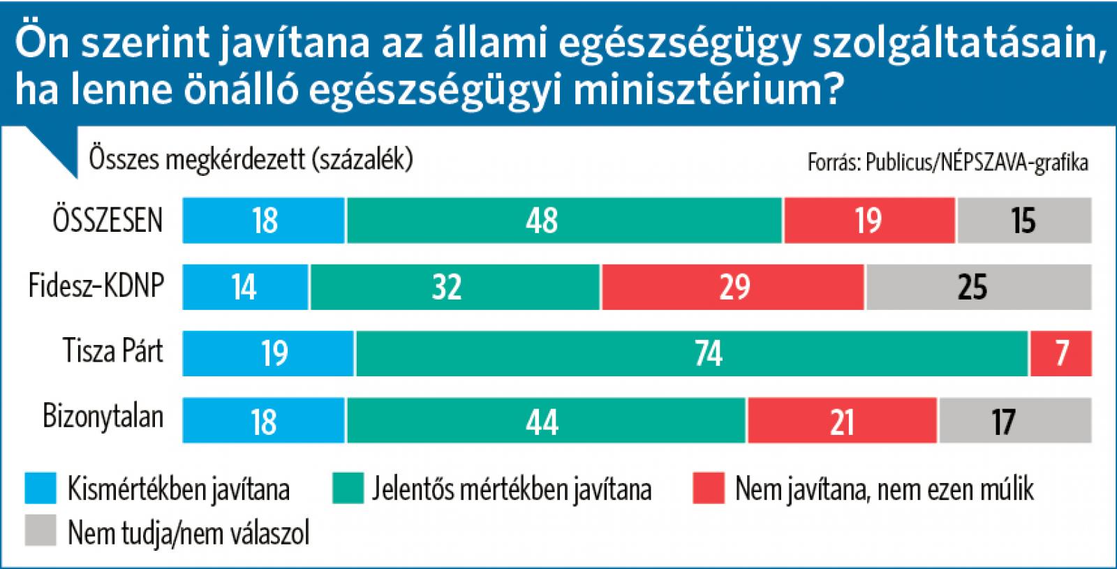 Magyar Péter bemutatta a Tisza egészségügyi programját, és meg is nevezte a párt szakminiszter-jelöltjétAz ellenzéki pártok szinte már hagyományos ígérete az ágazat megjavítására az önálló egészségügyi minisztérium felállítása. Mint a Publicus kutatásából is kiderült, ezzel - a politikai haszon szempontjából - aligha tévedhetnek, a közönség túlnyomó része vevő a tervre. Ugyan a válaszadók 19 százaléka szerint „nem ezen múlik”, szinte ugyanennyien (18 százalék) csak csekély pozitív eredményt várnak tőle, a magyarok mintegy fele (48 százalék) szerint ez jelentős szolgáltatás-javulást hozhatna az állami egészségügyben. Itt külön is érdekes a Fidesz-KDNP támogatóinak álláspontja, akik a jelek szerint nehezen tudják követni az Orbán-kormányok e tekintetben következetesen elutasító politikáját. Közel felük (46 százalék) szerint hasznos lenne, sőt harmaduk (32 százalék) szerint jelentős javulást is hozna az önálló egészségügyi tárca. E mellett a kormánypártiak feltűnően sokan (25 százalék) nem tudtak/akartak véleményt nyilvánítani e kérdésről.