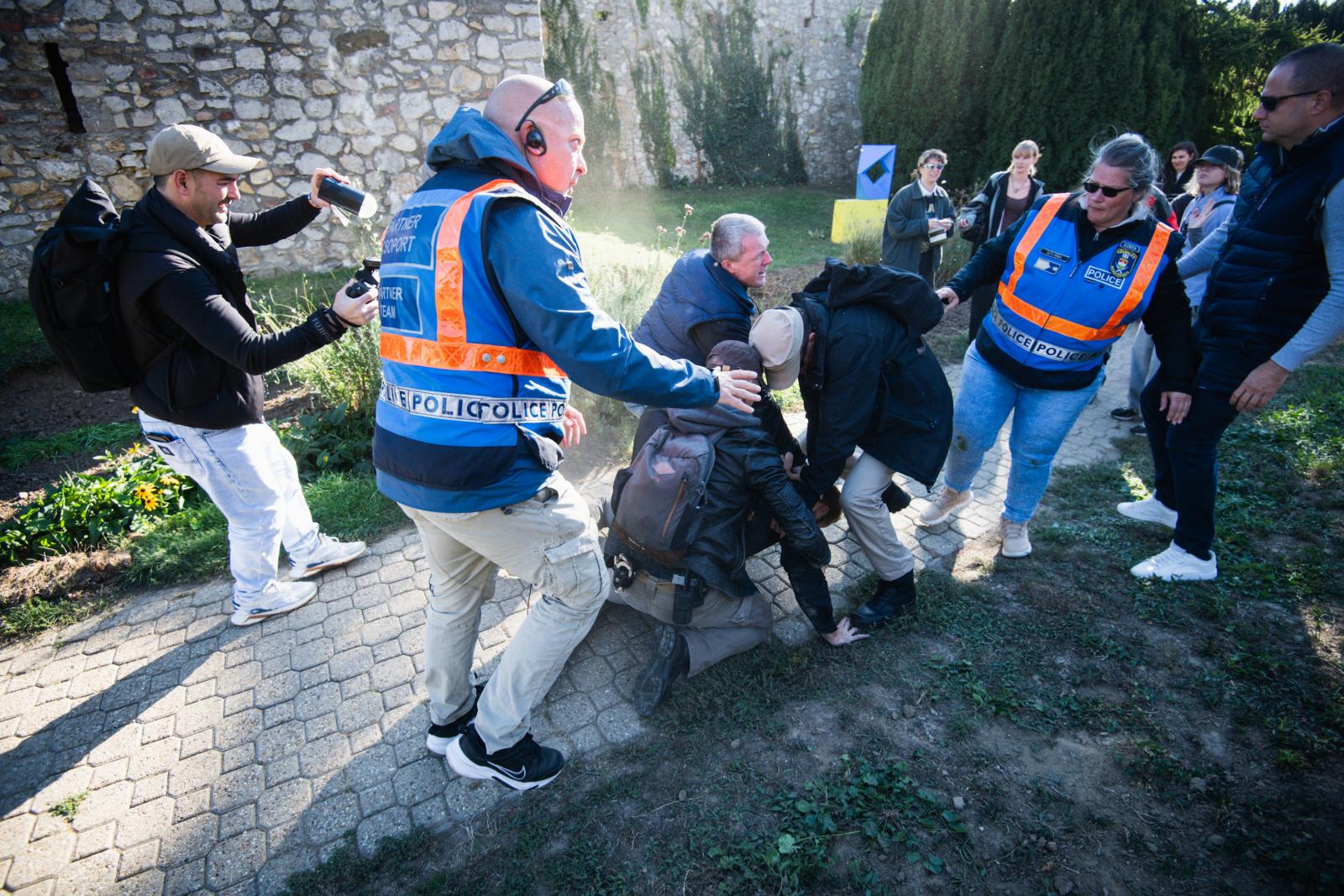 A menet egyszer csak felbolydulás kezdődött, annyit lehetett látni, hogy egy férfi legurul egy domboldalról, rendőrök veszik körbe, megbilincselik, majd a tömegből kiemelve az út menti tuják mögé viszik.