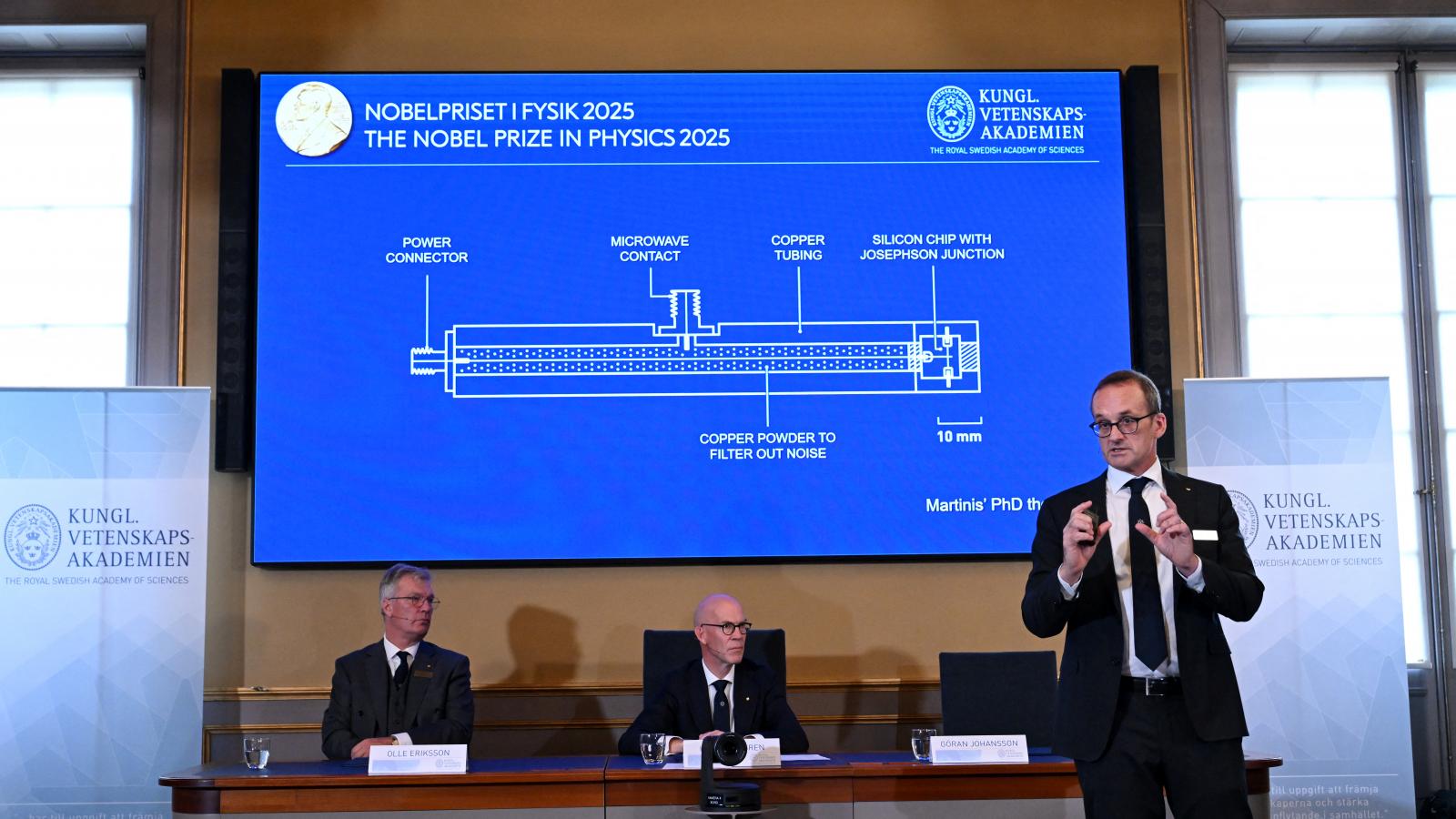 John Clarke és John M. Martinis, a Kaliforniai Egyetem kutatói, valamint Michel H. Devoret, a Yale Egyetem tudósa kapta idén a fizikai Nobel-díjat - derül ki a Svéd Királyi Tudományos Akadémia közléséből, amit a díj Facebook-oldalán is közzétettek. Az elismerés az elektromos áramkörben való makroszkopikus kvantummechanikai alagúteffektus és az energiakvantálás felfedezéséért járt.