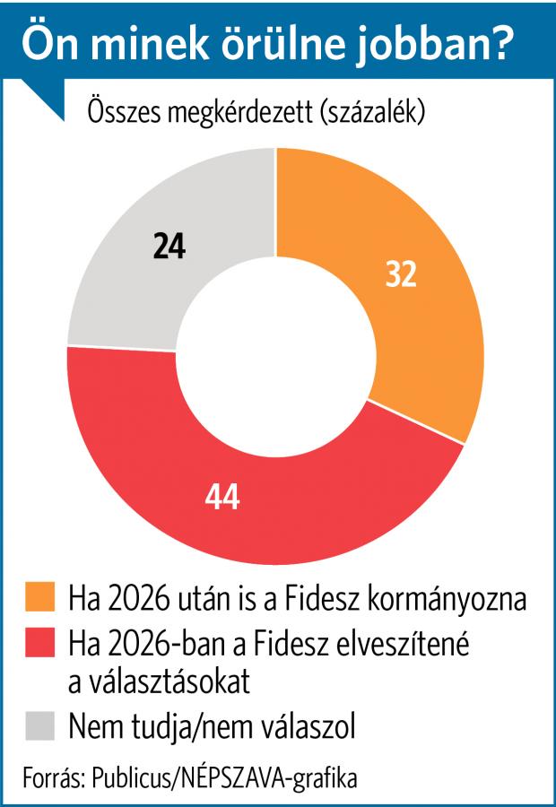 A magyar társadalom 32 százaléka örülne annak, ha a 2026-ban is a Fidesz maradna kormányon, ennél jóval többen (44 százalék) viszont annak, ha a Fidesz elveszítené a választást. A Publicus felmérése azonban azt is megállapította, hogy a reményektől függetlenül a relatív többség (41 százalék) a Fidesz győzelmére számít. Kevesebben vannak azok (37 százalék), akik úgy gondolják, hogy kormányváltás lesz.