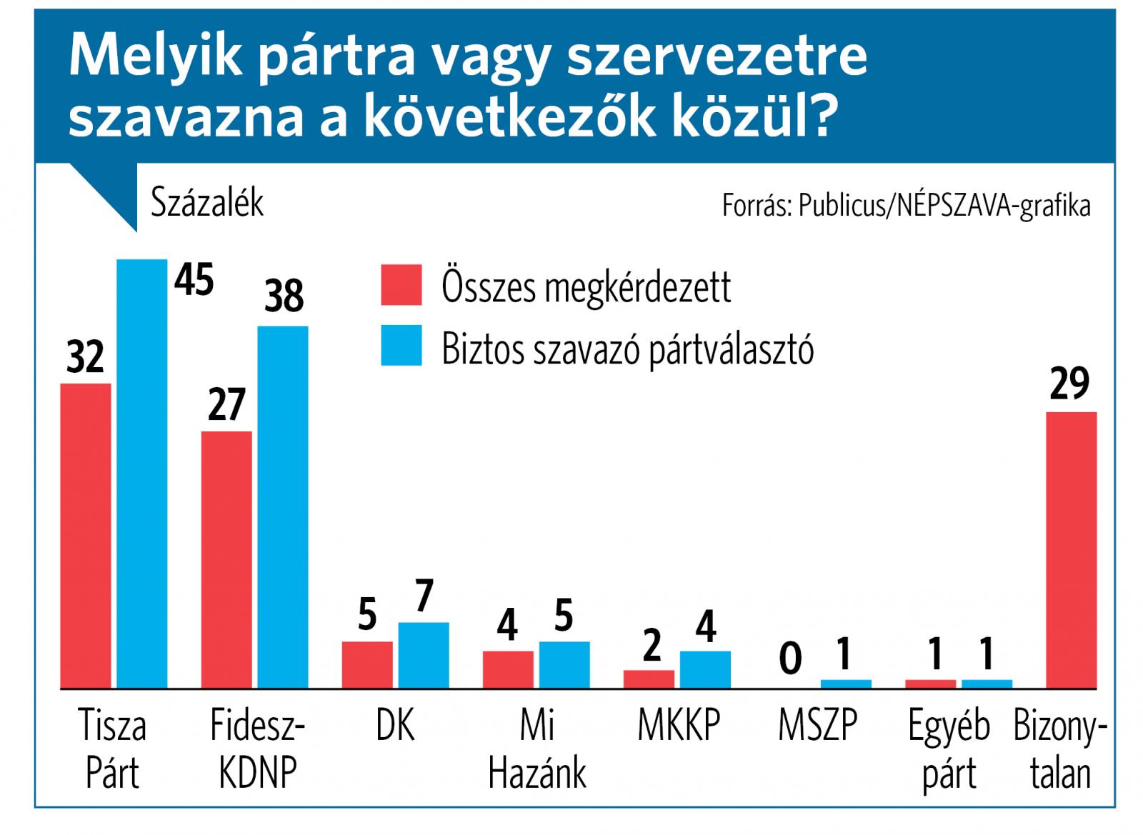 Jelen állás szerint a teljes népesség 32, a biztos szavazók 35, a biztosan szavazó pártválasztók 45 százaléka szavazna a Tisza Pártra, míg a Fidesz az említett csoportokban 27, 31, illetve 38 százalékot tudhat magáénak – mutatta ki a Publicus Intézet. A különbség tehát 5, 4 és 7 százalékpont a Tisza javára. Ezzel együtt a szeptemberi felméréshez képest a Fidesz valamelyest – 1-2 százalékkal – mindhárom kategóriában erősödni tudott. A bizonytalanok aránya 29 százalék.