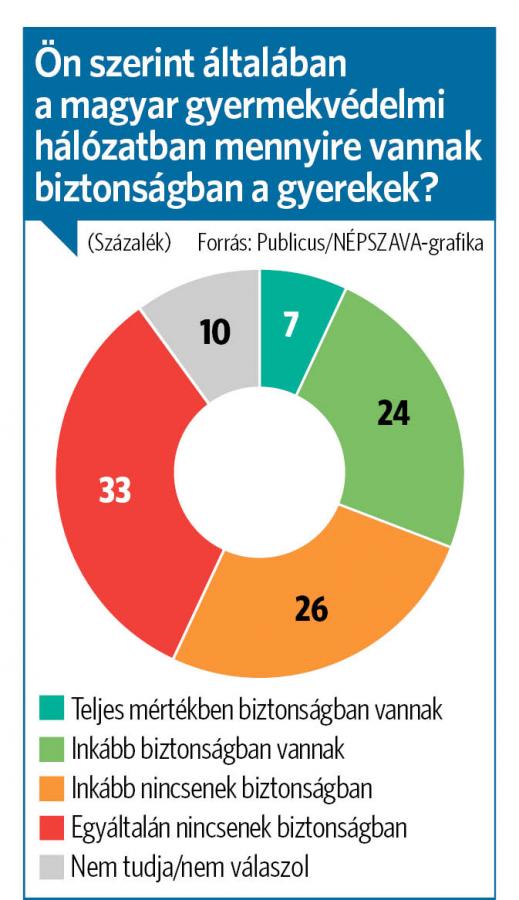 Összességében az ügyet ismerő megkérdezettek lesújtó véleménnyel vannak a gyermekvédelmi rendszer állapotáról, pontosan egyharmad szerint a kiskorúak egyáltalán nincsenek biztonságba a rendszerben, amelynek éppen az lenne a célja, hogy megvédje őket, további 26 százalék pedig az „inkább nincsenek biztonságban” választ jelölte meg. Vagyis 60 százalék nem hisz abban, hogy ezek az intézmények képesek betölteni a szerepüket. De nem csak a gyermekvédelemben nem bíznak, azt sem hiszik, hogy a hatóságok megfelelően végeznék a dolgukat ezekben az ügyekben: