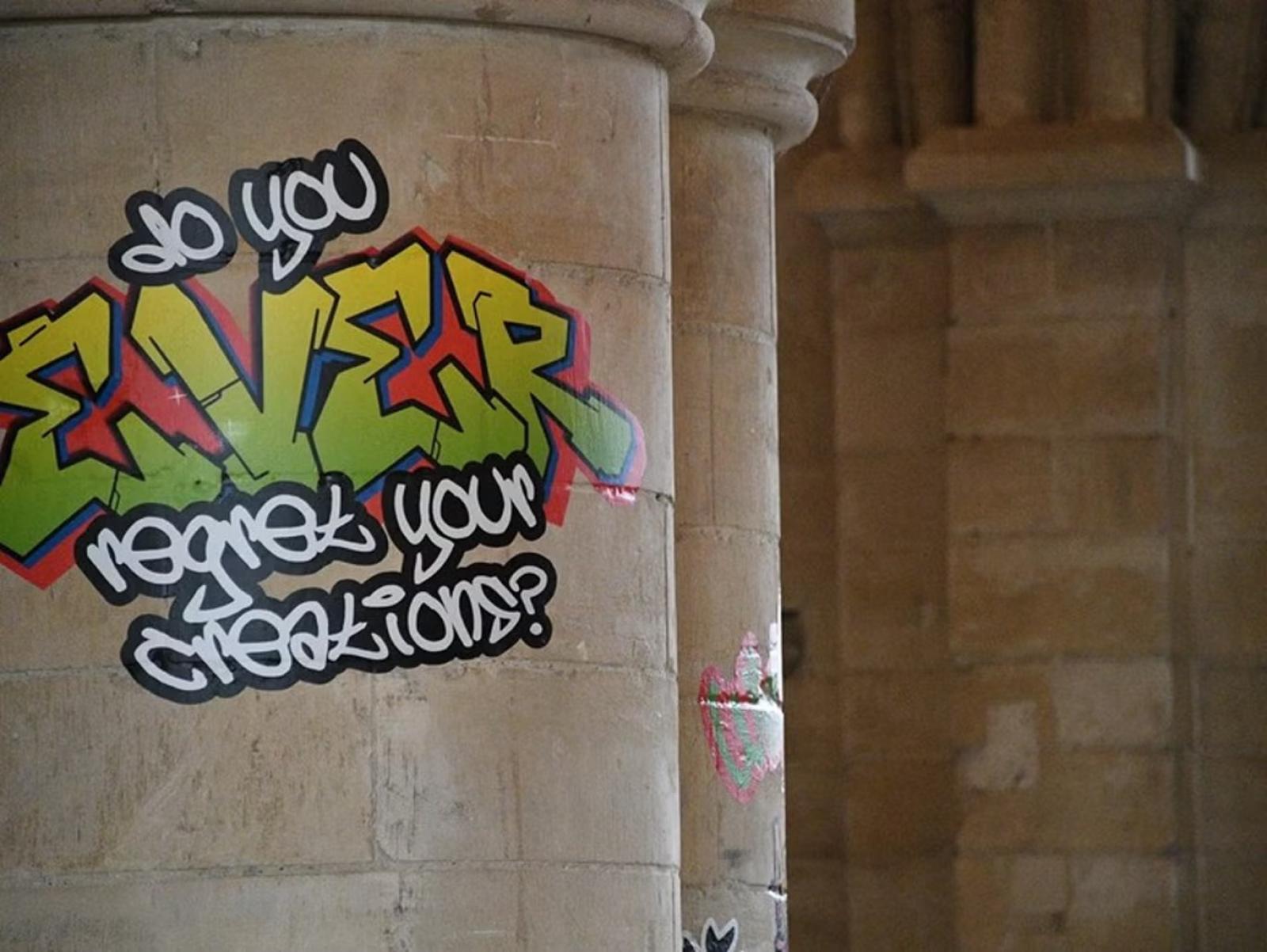 A hétköznapi emberek Istenhez intézett eredeti graffitijei személyes kíváncsiságokat ötvöznek az ókori építészettel. Merre tart az emberiség? Milyen a mennyország építészete? Mi történik, ha meghalunk? Alex Vellis kivételes együttműködésről számolt be Facebook-oldalán Jacqueline Creswell vizuális kurátor művészeti tanácsadóval és marginalizált közösségekkel.
