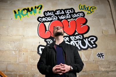 Különleges installációs kísérlethez nyerte meg a Canterbury katedrális anglikán püspökségét Alex Vellis brit–görög költő. A „Hallgass minket” projekt tagjaként graffitiket állítottak ki a délkelet-angliai székesegyházban.