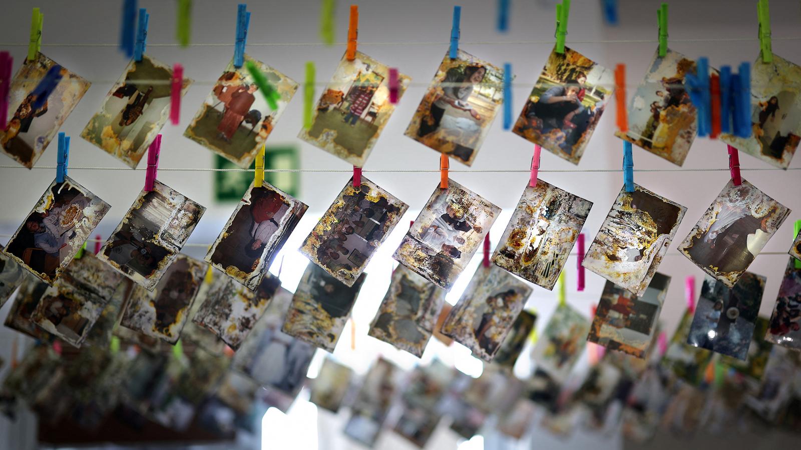 A nagyszabású projekt résztvevői a sárban fellelt fotókat ruhaszárító köteleken szárítják.