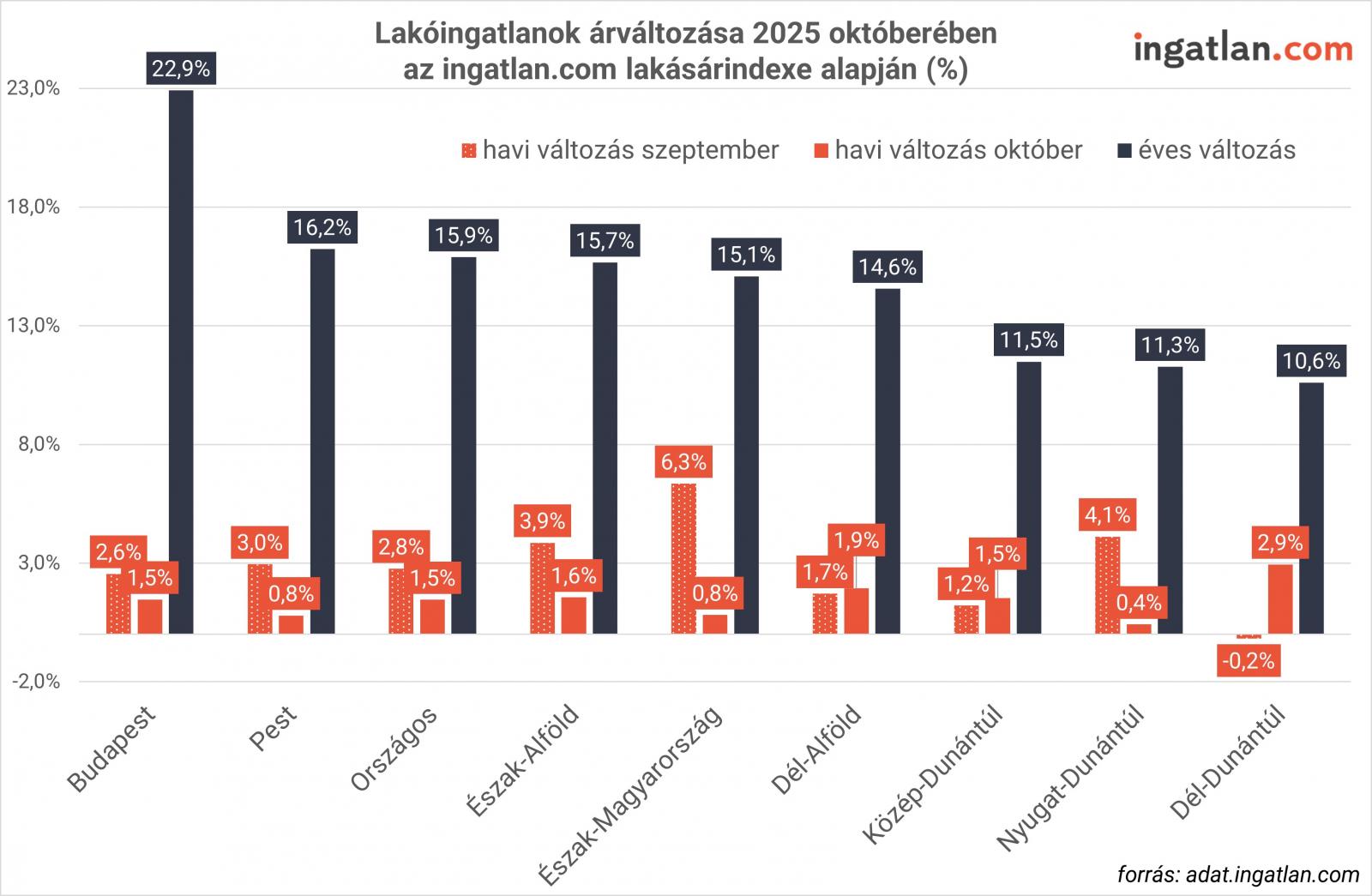 Balogh László, az ingatlan.com vezető gazdasági szakértője közölte, az adatok egyértelműen arra utalnak, hogy a lakásárak alkalmazkodnak a kereslet és kínálat új egyensúlyához. Hozzátette, a folyamat mögött több tényező is áll, októberben bővült a kínálat és mérséklődött a kereslet, a lakásárakat pedig ez a két tényező mozgatja leginkább.