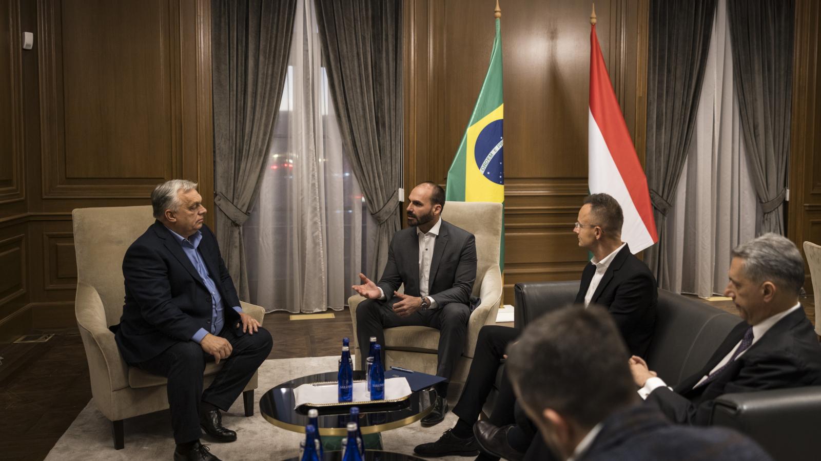 Orbán Viktor miniszterelnök csütörtökön, az Egyesült Államokban zajló látogatása során, Washingtonban találkozott Eduardo Bolsonaro brazil képviselővel, az államellenes bűncselekmények miatt elítélt volt brazil elnök, Jair Bolsonaro fiával. Az MTI által közzétett fotóról az is kiderül, hogy Szijjártó Péter külgazdasági és külügyminiszter, valamint Lázár János építési és közlekedési miniszter is részt vett a tárgyaláson.