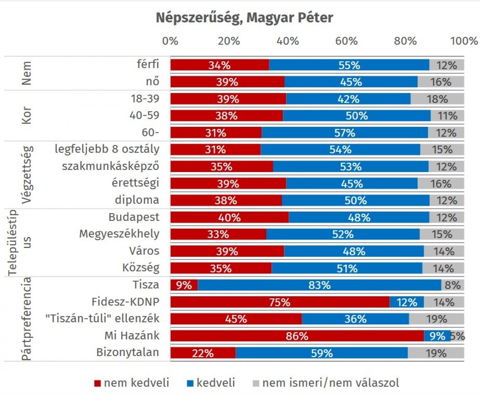 ebben a hónapban már jobban teljesített Magyar az idősek körében (57 százalék), mint a fiataloknál (42 százalék). Más demográfiai csoportokban is megfigyelhető, hogy nemcsak a tipikus ellenzéki szavazó kedveli őt, hanem nagyjából kiegyenlített arányban fordulnak elő szimpatizánsai a legtöbb végzettségi, településtípusi csoportban.