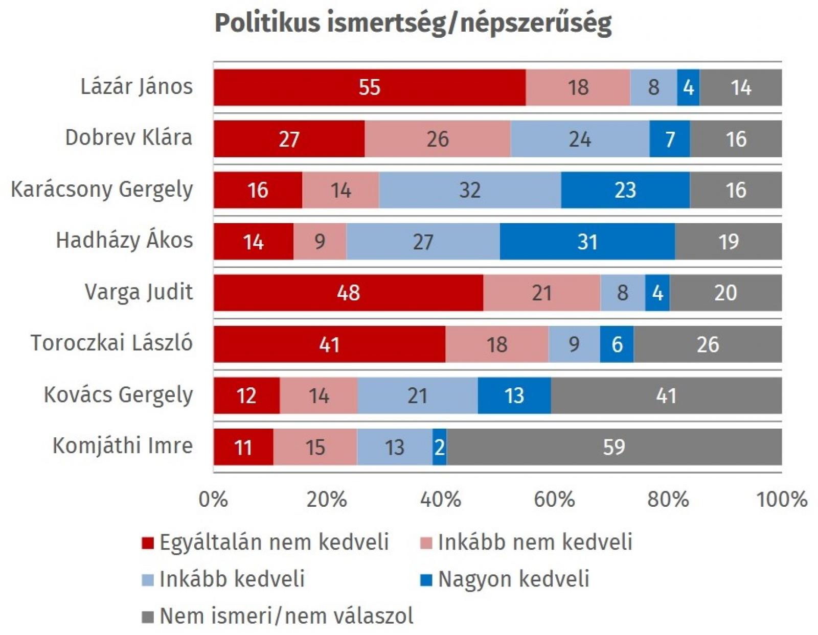 A felmérés szerint Karácsony Gergely, Budapest főpolgármestere az egyik legtöbbet szereplő, és kétségkívül az egyik legnépszerűbb ellenzéki politikus. Karácsony valamivel népszerűbb, mint Magyar Péter, a teljes népesség 23 százaléka nagyon kedveli, további 32 százalék inkább kedveli, vagyis a magyarok több mint fele jó véleménnyel van róla.