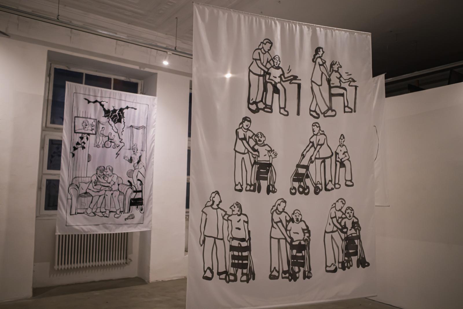 A boszorkány szó hallatán az ember elsősorban a középkorból ismerős hosszú hajú, fekete ruhás és olykor seprűn repülő hölgyekre gondol, akik mágikus erővel bírnak. Poór Dorottya képzőművész nemrég nyílt, Földi boszorkányok című kiállításán azonban nem ilyen, hanem modern boszorkányokat láthatunk, akik szintén varázserővel bírnak, csak éppen nem repülnek, hanem másokon segítenek, például azzal, hogy gondoskodnak róluk. A budapesti Fiatal Képzőművészek Stúdiója Egyesület (FKSE) fehér falú terében is ezt láthatjuk a mennyezetről logó, nagy méretű textileken, melyeken az idősgondozás és a hétköznapi gondoskodás jelenetei láthatók. A kiállítás apropója, hogy az alkotónak megjelent a More Witches című, hétköznapi boszorkányokról szóló képregénye, amelynek szereplői szintén gondoskodnak egymásról, és a tárlaton is e füzet rajzos jeleneteit láthatjuk felnagyítva a textileken vagy kissé átalakítva.