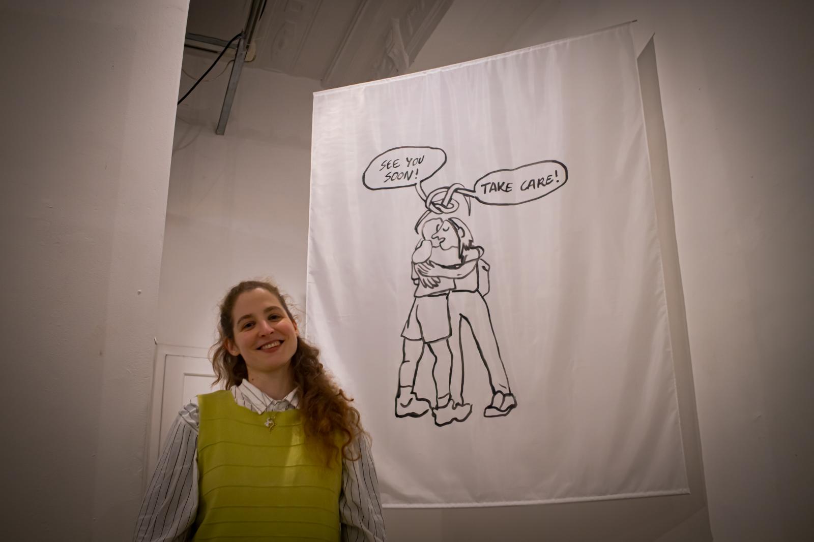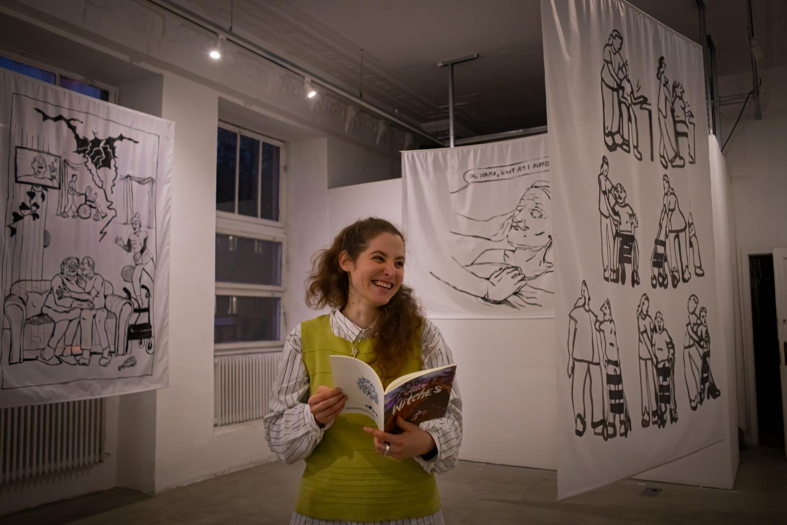 – Amikor ezt a tárlatot terveztem, az érdekelt, hogyan lehetne a képregény műfaját kiterjeszteni egy kiállítótérben, ezért is akartam a rajzokat textilekre is felvinni, és azokat a tér különböző pontjain installálni – mondta Dorottya, aki képzőművészként végzett, de idővel belekóstolt a képregények világába, és úgy döntött, maga is rajzol egyet. 2023-ban született meg az első zine-je – azaz mikrokiadó által megjelentetett, ISBN- és ISSN-számmal nem rendelkező kiadványa –, a most megjelent képregénye pedig egy korábbi folytatása, a művész 2024-ben már kiadott egy boszorkányos tematikájú füzetet Witches (Boszorkányok) címen, most pedig a More Witches (Még több boszorkány) című füzete látott napvilágot.