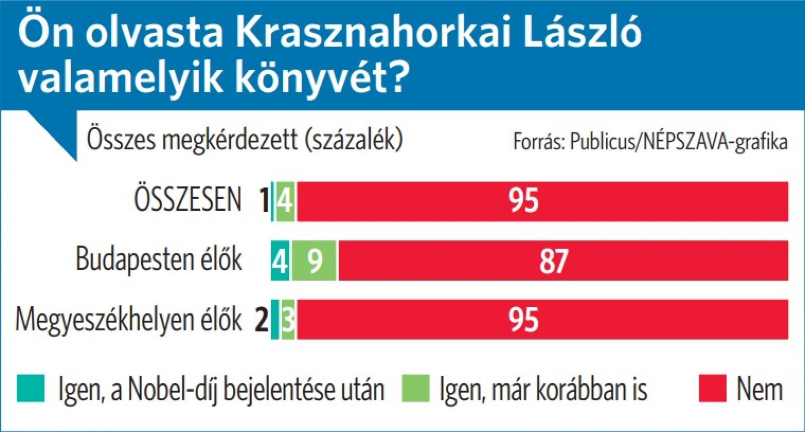 Ha ezek után valaki vitatná a Nobel-díj marketingerejét, mégis érdemes a felméréssel érvelni: a budapesti válaszadók 4, a megyeszékhelyen élők 2 százaléka a hír hallatán vett elő Krasznahorkai-kötetet. Az azonban ezzel együtt is tagadhatatlan, hogy a felmérésben részt vevők 95 százaléka nem olvasta a friss magyar Nobel-díjas író egyetlen művét sem. Meglepetésünkre