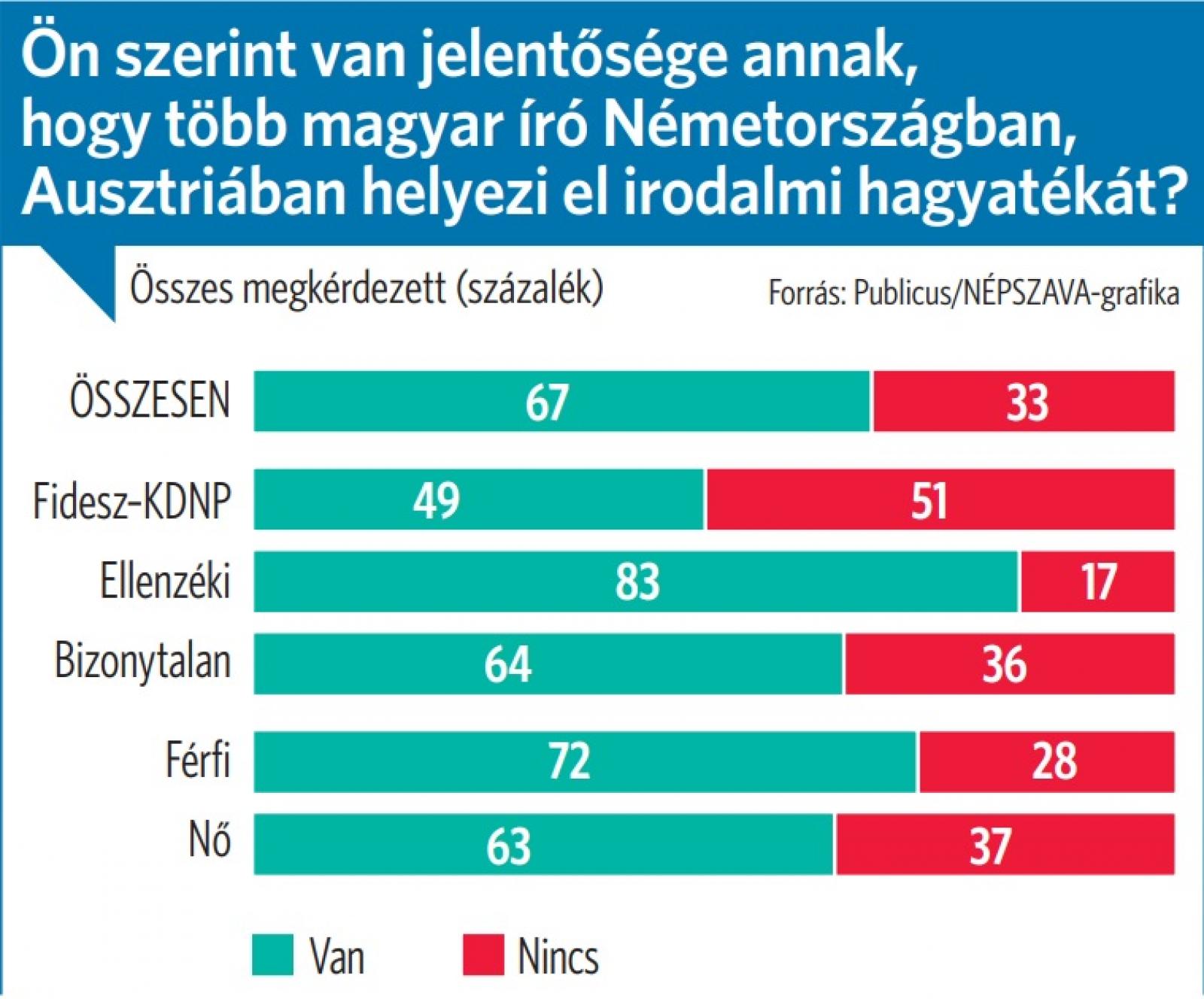 A legnagyobb differencia kormánypárti és ellenzéki szavazók között a kultúrpolitikát közvetlenül érintő problémafelvetésben mutatkozik meg. Azaz abban a kérdésben vélekednek eltérően, hogy van-e hordereje annak, hogy több magyar író külföldön – Németországban, Ausztriában – helyezte el írói hagyatékát. Erről a Fidesz híveinek nem egészen fele – 49 százalék –, míg az ellenzékiek túlnyomó többsége – 83 százalék – gondolja, hogy van jelentősége. És másképp vélekednek nők és férfiak is: míg előbbiek 63, utóbbiak 72 százaléka tartja fontosnak ezt a döntést.