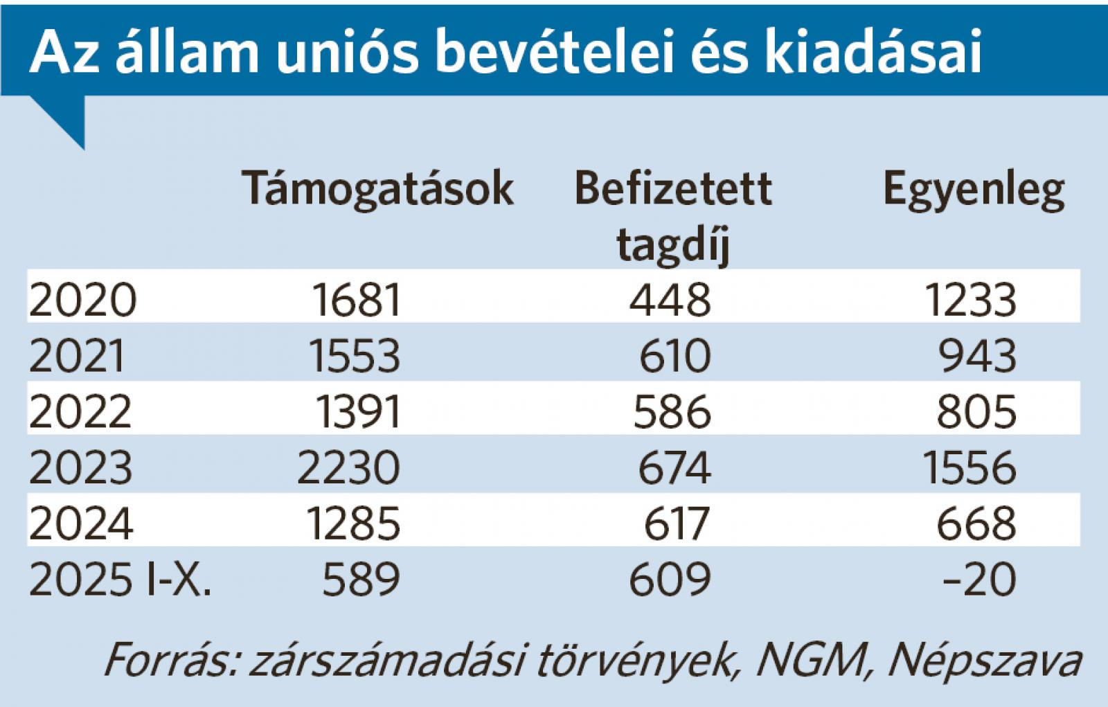 A magyarok 43 százaléka a hónap végére kifogy a pénzéből, semmit nem tud megtakarítani „Ha egyszer hatalomra kerülnek, belülről fogják korrumpálni a rendszert. Lassan teszik, hogy az emberek ne vegyék észre azonnal”Ennek megfelelően fokozatosan csökkentek a költségvetésbe érkező uniós pénzek: 2021-ben 1575, 2022-ben 1391 milliárd forint érkezett Brüsszelből, 2023-ban átmenetileg megugrott 2230 milliárd forintra, tavaly viszont egész évben 1285 milliárd forintnyi uniós támogatás folyt be az államháztartásba. Az éves uniós befizetésünk – a forint-euró árfolyam ingadozásának függvényében –450-674 milliárd forint között ingadozott, így tavaly például a ki- és befizetések egyenlege 668 milliárd forint volt a korábbi években megszokott ezer milliárd forint körüli összeggel szemben. Idénre teljesen elapadtak a támogatások, így október végéig 589 milliárd forint érkezett, ami 20 milliárd forinttal kisebb a befizetett összegnél.