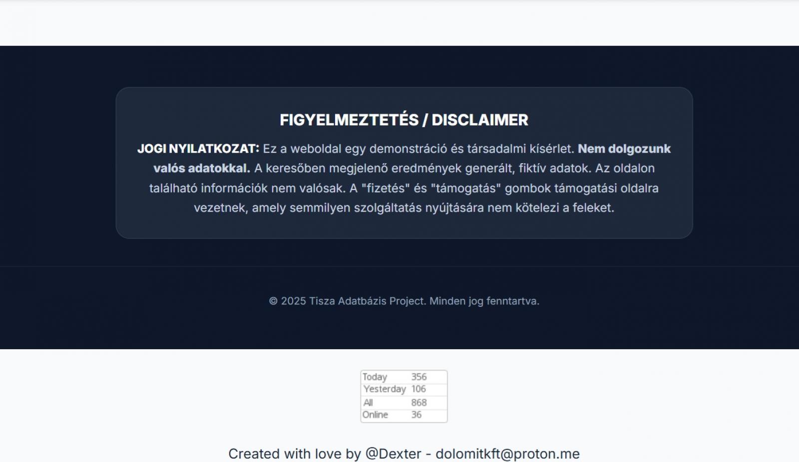 Az eddig sem túl tiszta történet akkor válik végképp követhetetlenné, amikor elolvassuk a portál alján a jogi nyilatkozatot. Ebben a következő áll: „Ez a weboldal egy demonstráció és társadalmi kísérlet. Nem dolgozunk valós adatokkal. A keresőben megjelenő eredmények generált, fiktív adatok. Az oldalon található információk nem valósak. A »fizetés« és »támogatás« gomb támogatási oldalra vezet, amely semmilyen szolgáltatás nyújtására nem kötelezi a feleket.”