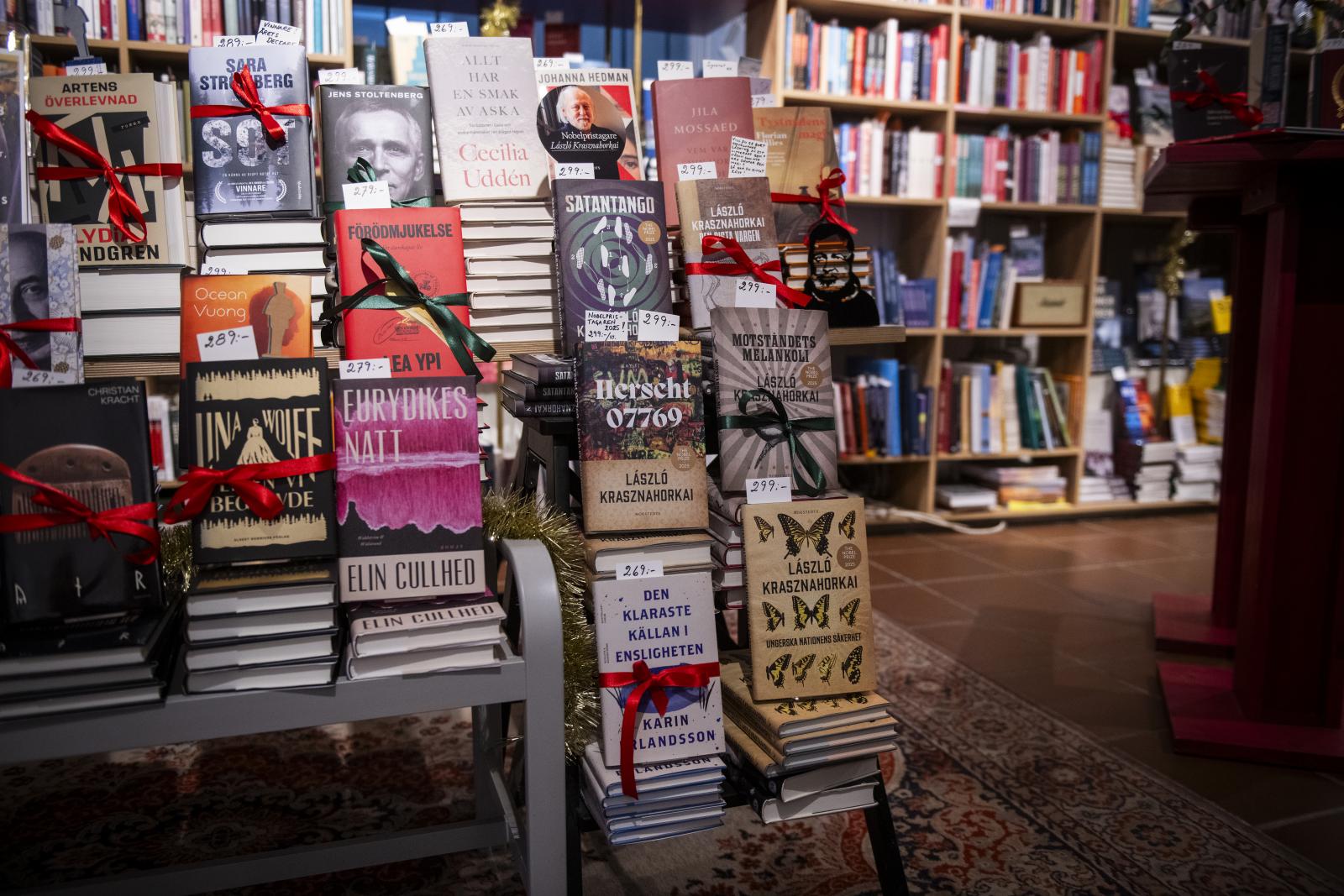 Szükség is van rá, az árus szerint a Krasznahorkai-könyveket viszik, mint a cukrot, főleg a Nobel-díj bejelentése óta. Szemet szúrhat viszont, hogy a hírt a kirakatban nem az új mű hanem a 2021-ben megjelent Herscht 07769 című kötet hirdeti, de mint megtudtuk jó pár szövevényes utcával arrébb a város egyik legrégebbi, a XIX. század óta működő könyvesboltja, a Hedengrens Bokhandel könyvárusától, az a legnépszerűbb, bár tény, aki Krasznahorkait olvas, annak emellett jellemzően a Sátántangó sem marad ki, ezért biztos ami biztos, tartanak mindenből épp eleget. – Karácsony van, Svédországban már szinte szokás, hogy ilyenkor mindenki megveszi ajándékba az év Nobel-díjasának valamelyik kötetét – magyarázza, hozzátéve,