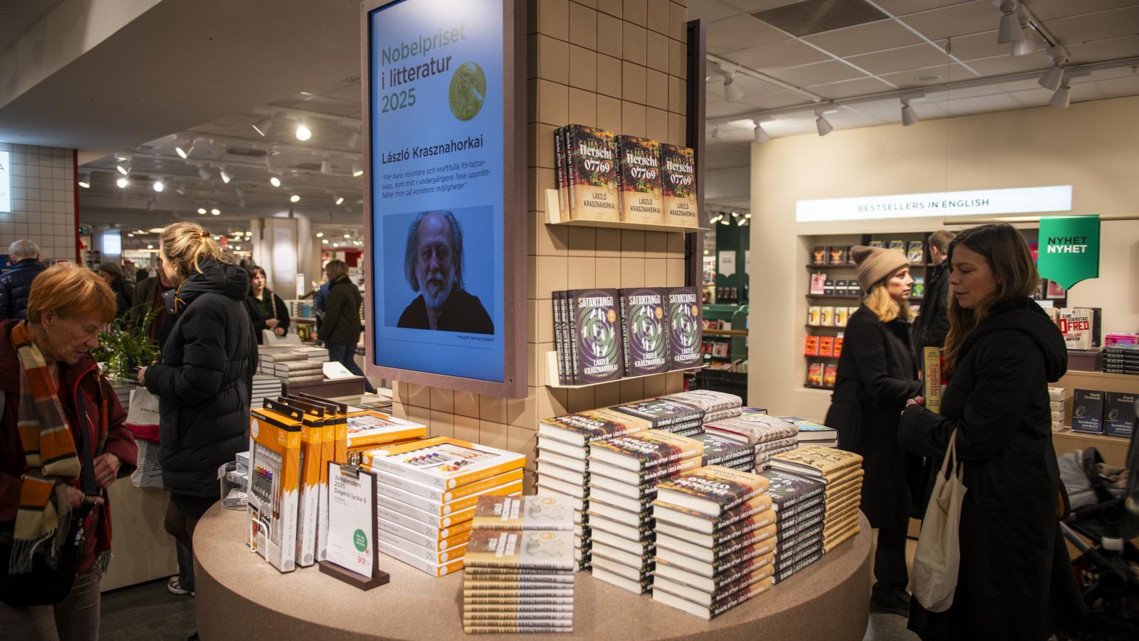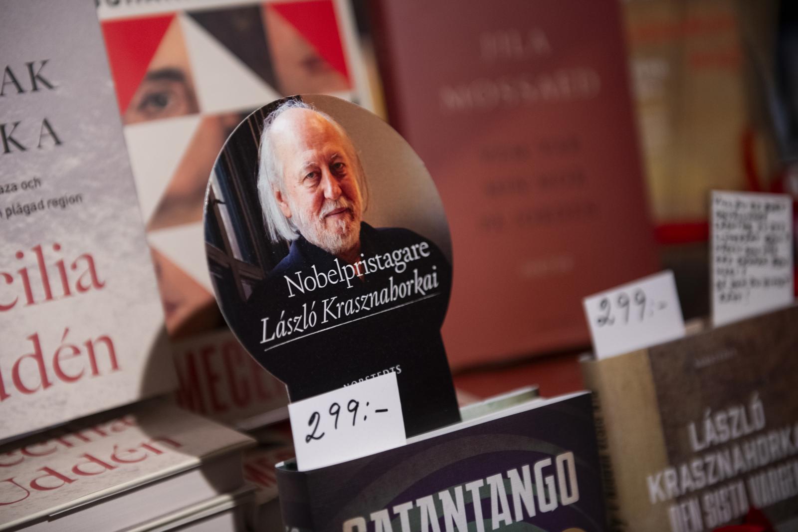 – Ugrásszerűen megnőtt a kereslet, nem is tudom most biztosan megmondani, hogy melyik könyvéért igazán, de a népszerűség szembetűnő volt – magyarázza sietve az Akademibokhandeln egyik árusa, akinek az idegességénél csak az a sor növekszik gyorsabban, amely a pult előtt nő, amíg szóval tartom. De nem csoda, a vásárlók kígyózó sorának nem kell több pár percnél, hogy a bejárattal szemben a beépített kijelzőn feltűnő Krasznahorkai-portré, illetve az alatta kupacokba rendezett könyvekből ítélve az írónak dedikált oszlophoz érjen.