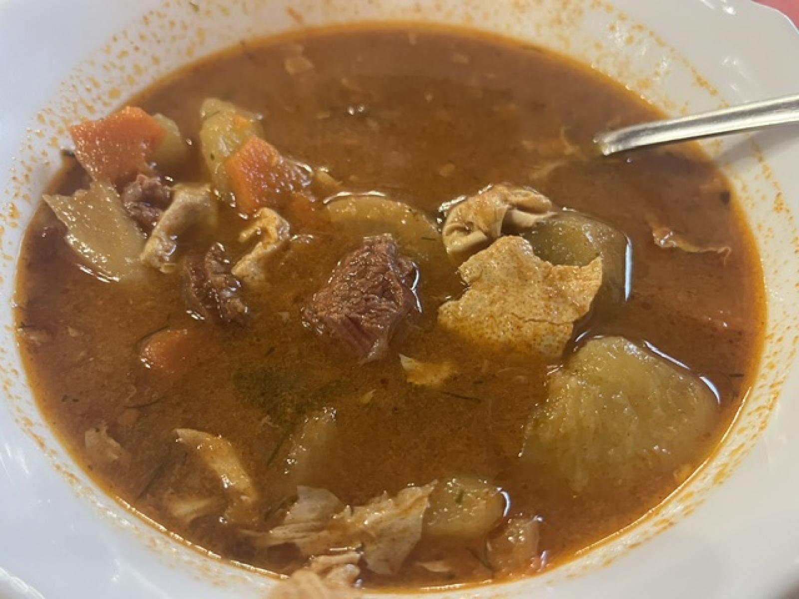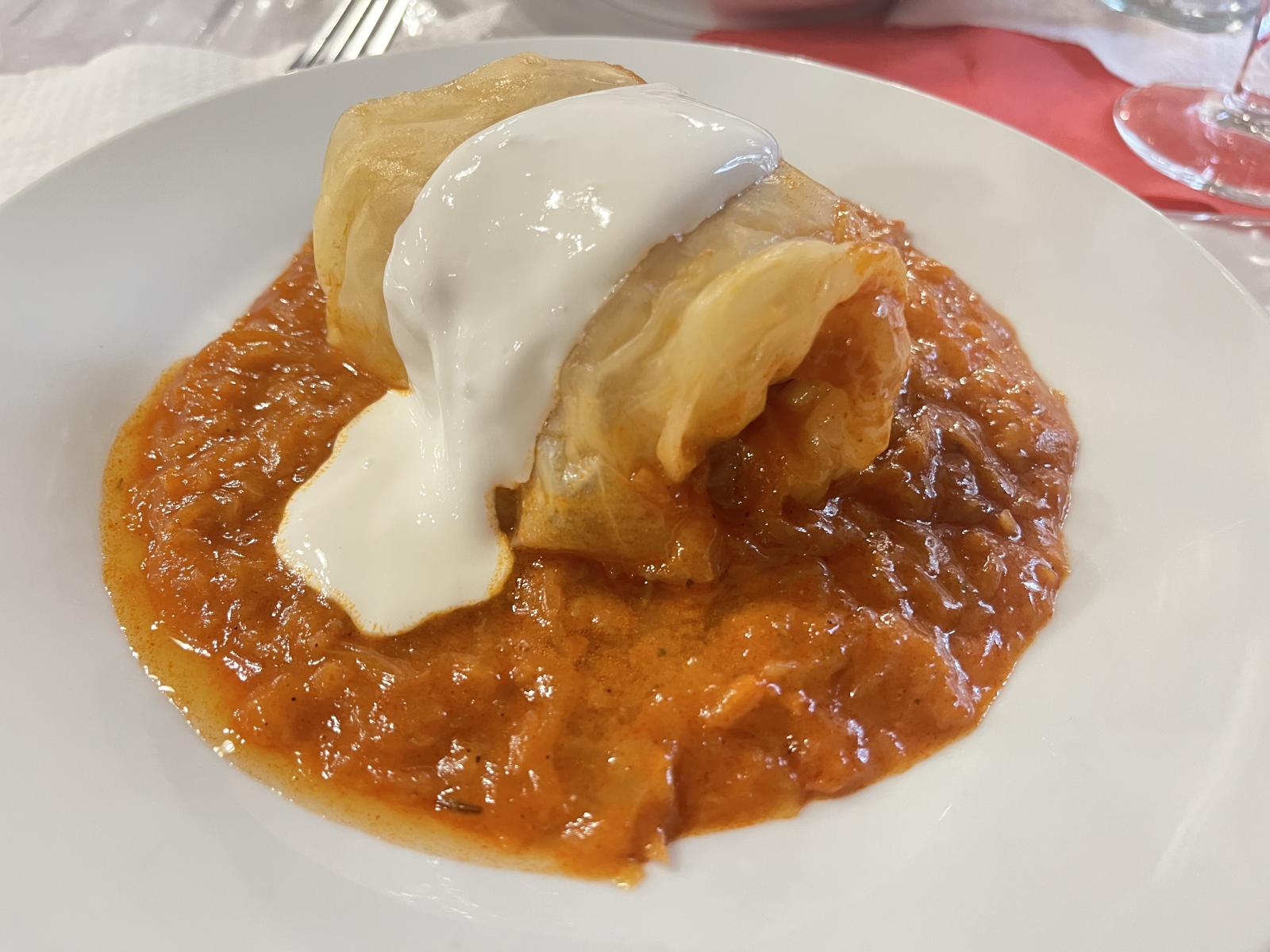 A birka- és a marhapörkölt közül az utóbbira voksolunk némi főtt burgonyával, csak a kitálalás látványa miatt. Sűrű szaftunk magas minőségű édes-nemest sejtet, és mutatóba egészen finoman csípőset, a hagymamennyiség is szép harmóniában van, a hús kifogástalanul omlik. Mellé káposztával töltött paprikát és színes pepperoniválogatást szegedetünk a savanyústálból. Akár fel is állhatnánk dolgunk végeztével és a jóllakottság érzésével, de hát nem szórakozni vagyunk. A svédasztal töltött káposztával amúgy is hívogat, odébb nagy tál zsíros tejföl, abból loccsantjuk nyakon. A kellemesen res levelekbe göngyölt darált hús-rizs arány puhaságába se tudunk belekötni. Már igazán csak az íze miatt kanalazunk nagy kedvencünkből, a házi tarhonyából, amiben színsertés- és marhadarabok keverednek: a sajtot már túlzásnak is érezzük a tetején, de ezt talán csak az emberesen feszülő pólónk mondatja velünk.