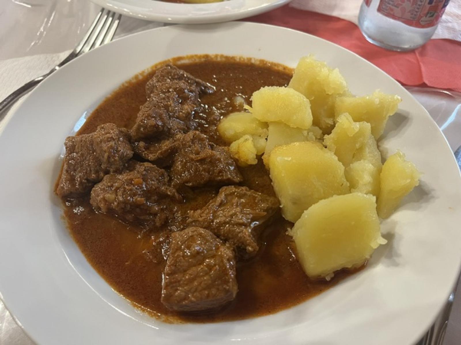 Helyet foglalunk, oldódunk a billentyűs hangulatemelő játékában, így fogadjuk a felszolgáló érkezését. Mentes víznél többre nem vállalkozunk. Néhány szóban tájékozódunk a felhozatalról, és közben csodálkozunk, hogy a jelentős vendégsereg nem merítette le a pimaszul darázsderekú pincérlány elemeit, merthogy lankadatlan kedvességgel válaszol a kérdéseinkre. Miután magunkra maradunk, a hosszú svédasztalon áll meg a tekintetünk. Aztán ugyanezt a fókuszt tartjuk közelről is. Bár érezzük, hogy taktikailag aligha bölcs, és elbizakodottságunk később megbosszulhatja magát, mégis levessel kezdünk. A marhagulyás mégiscsak marhagulyás. Az ebédhez kissé kései órára tekintettel az utolsók között járulunk a melegen tartókhoz, a tartalom mégis hibátlanul gazdag. Pedig ilyen esetben megszoktuk, hogy szerencse kell néhány húsdarab kihorgászásához másutt. Ezúttal a kövér burgonyadarabokat igyekeztünk mellőzni, a nemesebb összetevőkre és az előttünk álló megpróbáltatásokra tekintettel. A gulyás sűrű lével és füstölt ízekkel köszön be, kolbász is került bele enyhén csípősen. Az ételkínálatos edukációt végző személyzet elmondása szerint még némi kapor is szóratott a tetejére, de ez lényegében észrevehetetlen. Nem mintha a kaporral ellenszenveznénk, hiszen pikáns legényfogó levesek lényege az a tárkony és a borsikafű mellett.