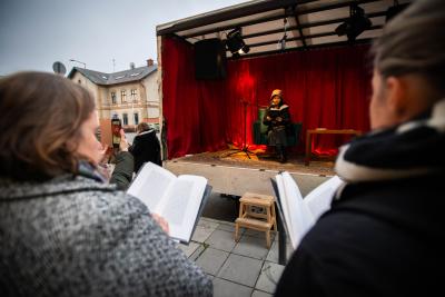 Huszonnégy órán át járta Budapestet egy teherautó utcai felolvasással a Nobel-díjas magyar íróműveiből. A BMSZKI hajléktalanszálló elől indult, megállt a Néprajzi Múzeumnál, az Agóra Irodaháznál, a Hadik Kávéháznál, végül pedig a Magvető Kiadó előtt. Fotógaléria.