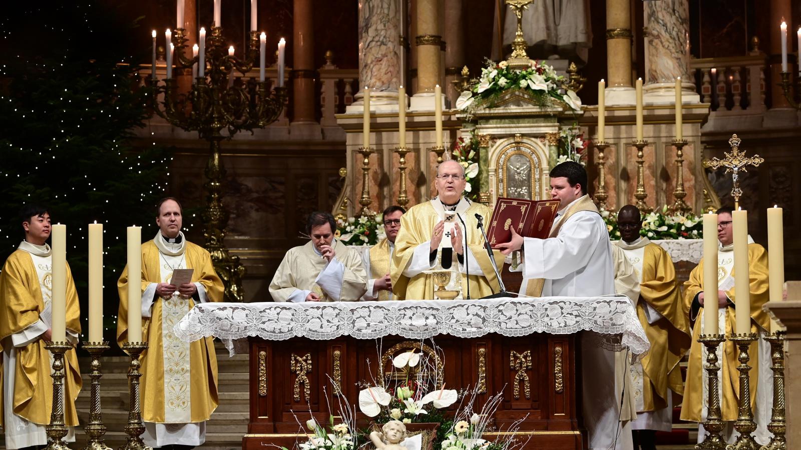 A bíboros a zsúfolásig megtelt Szent István-bazilikában arról beszélt: Jézus az irántunk érzett szeretetből, szándékosan adja át magát a teremtett világnak, hogy szüksége legyen az állatok és az emberek testének melegére, hogy szüksége legyen az ételre és talán a pásztorok ajándékaira is. Jézust ez a sebezhetőség végigkíséri egész földi élete során. Szenved attól, hogy nem értik meg, nem fogadják el, és végül keresztre feszítik. De ennyire, teljesen adja át magát - mondta.