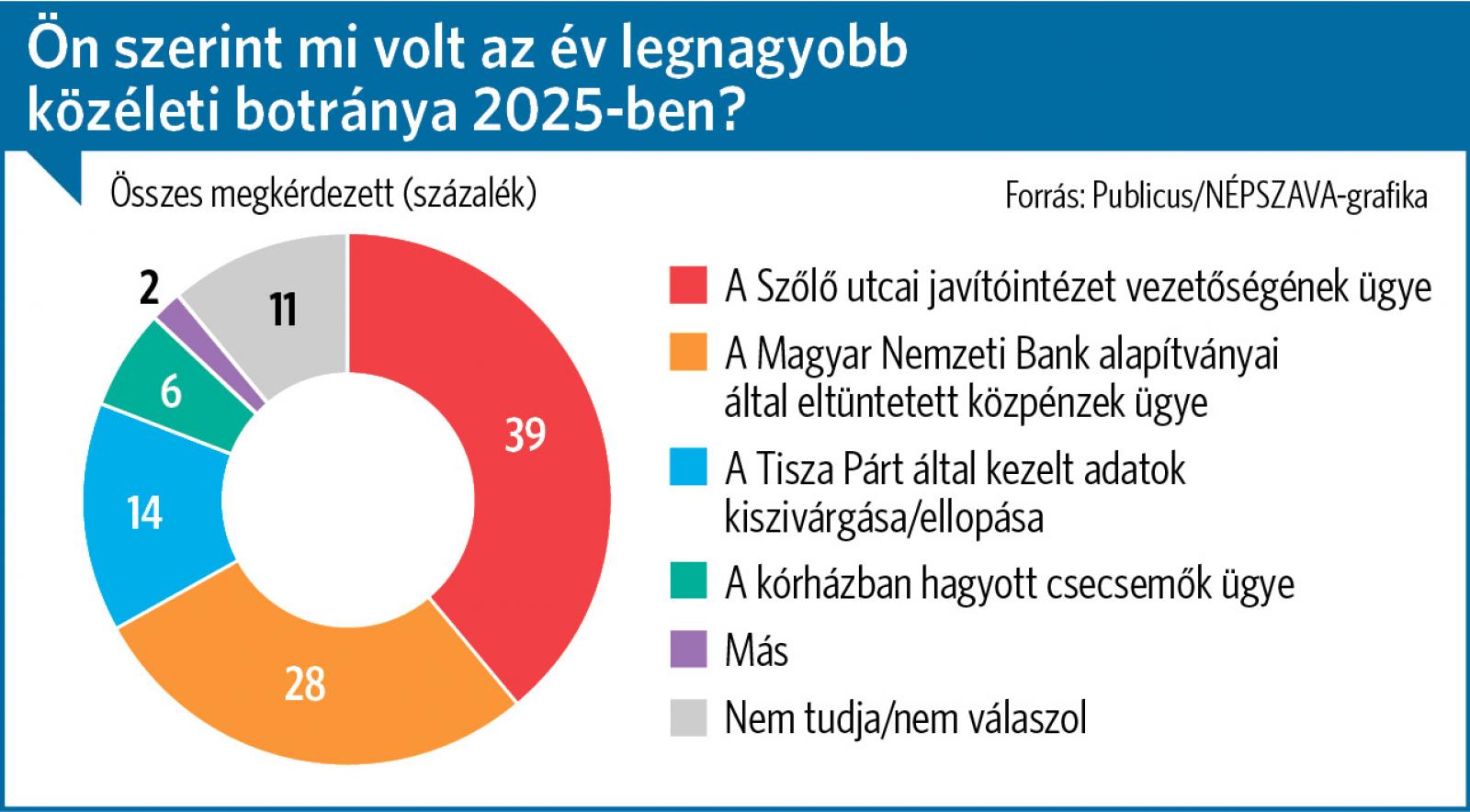 Ennél egyértelműbb a helyzet az év legnagyobb közéleti botrányának megítélésénél: a magyarok 39 százaléka szerint a Szőlő utcai ügyként elhíresült bűncselekmény-sorozat áll az első helyen. Ennél több mint 10 százalékkal kevesebbet kapott, így a második helyen végzett a Magyar Nemzeti Bank alapítványai által eltüntetett közpénzek ügye. A Tisza Párt által kezelt adatok kiszivárgása/ellopása a harmadik legnagyobb közéleti botrány az emberek szerint, de erre már csak összesen 14 százalék voksolt, 6 százalékot kapott a kórházban hagyott csecsemők ügye.