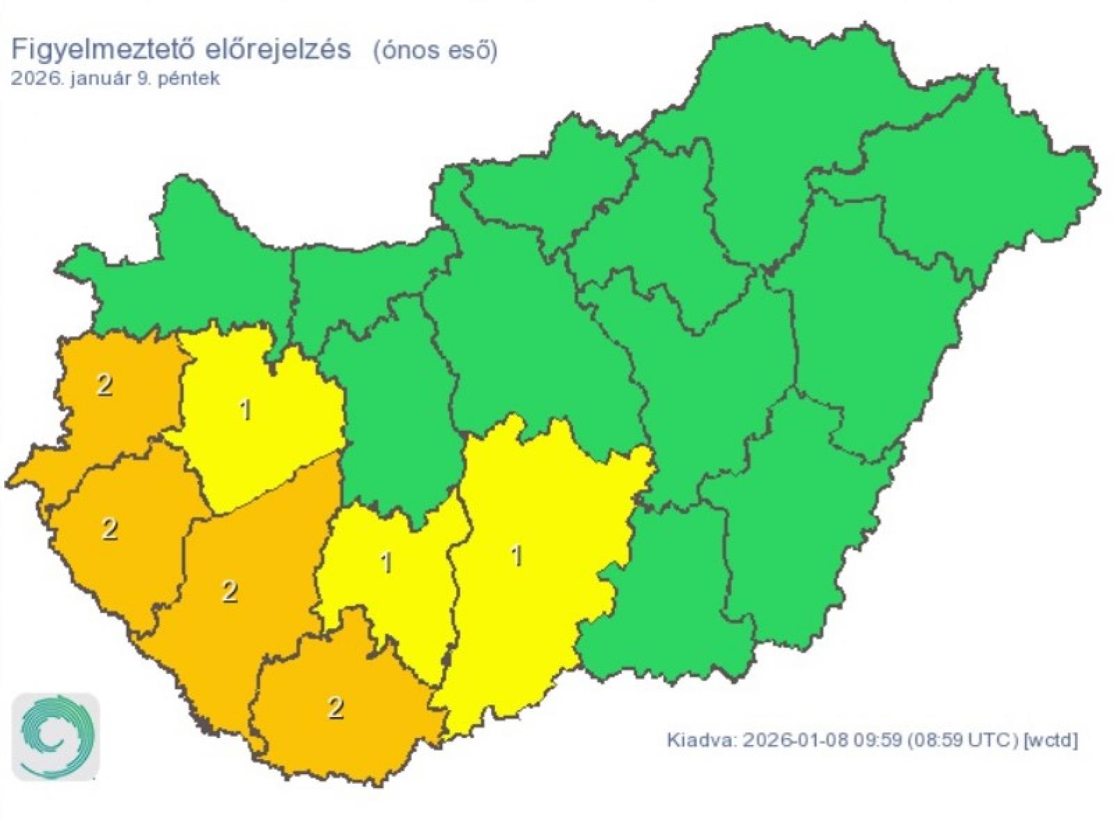 A késő délelőtti, déli óráktól a délnyugati országrészben vegyes halmazállapotú csapadék (északabbra kisebb havazás), kiemelten ónos eső várható. A tartós, több órás csapadékhullásból jelentős mennyiségű ónos eső is előfordulhat, így akár a legmagasabb fokú, piros riasztás is érvénybe léphet. Nagyobb területen a hajnali, reggeli órákban ónos esőtől függetlenül is csúszósak lehetnek az utak.