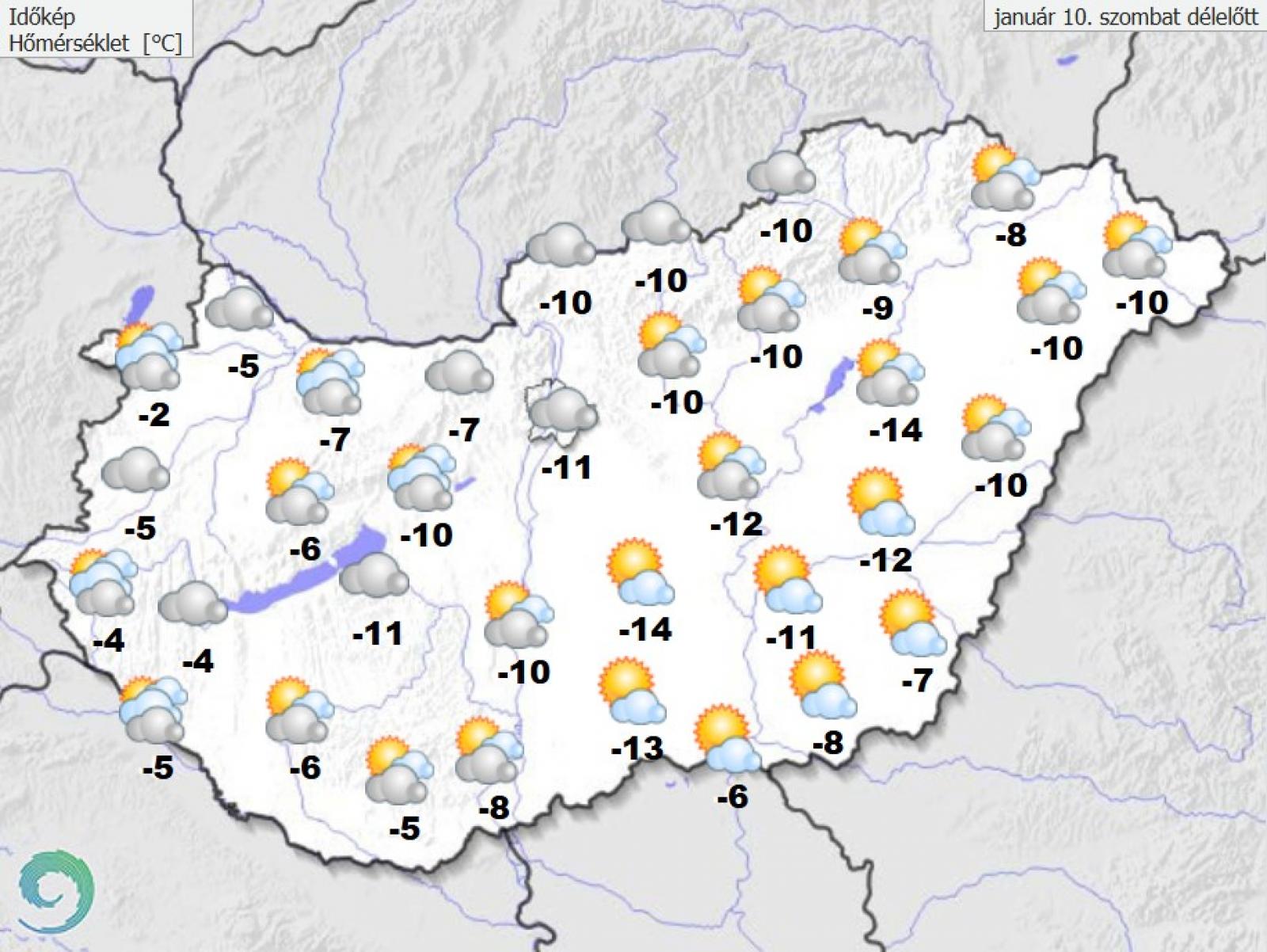 Szombaton általában erősen felhős idő valószínű, de lesznek átmenetileg naposabb tájak is. Reggel délen is megszűnik a havazás, ónos eső, napközben már általában nem lesz csapadék, de este helyenként szállingózhat a hó. Délutántól, estétől főként északkeleten és az északnyugati határ közelében megélénkül, olykor meg is erősödik az északias szél, amely ott gyenge hófúvást is okozhat. Kora délután -8, +2 fok várható, a nyugati határon emelkedhet néhol 0 fok fölé a hőmérséklet.