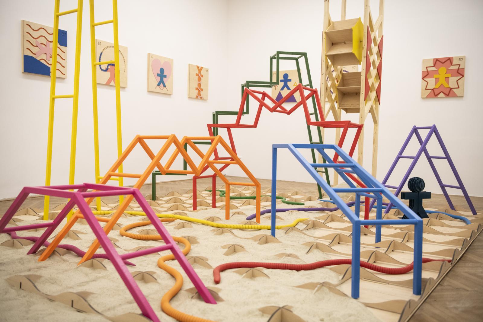 A Kígyók és létrák című munkája már a társadalmi mobilitásról szól, és az azonos című indiai gyökerű társasjáték alapján készült. Tavaly a budai The Space galériában is kiállított mű konkrétan egy játszóteret ábrázolt, amelyen színes, létra alakú mászókák és fakígyók keresztezték a teret, míg a száz mezőből álló játékteret homok borította. Utóbbi az életben való előrehaladást szimbolizálta, a játékosok célja pedig az volt, hogy a lehető leggyorsabban elérjék a százas mezőt, ahol a javak felhalmozása jelképesen megtörténik. De akárcsak a valóságban, itt is voltak nehezítő és könnyítő tényezők: a táblán elhelyezett létrák az előrejutást, míg a kígyók a visszaesést szimbolizálták. A kiállítás viszont máshogy is megidézte a valóságot: a résztvevőknek a játék megkezdése előtt a galériában egy kis zsákból dobókockát kellett húzniuk, melyek mindegyike egyedi számozású volt.