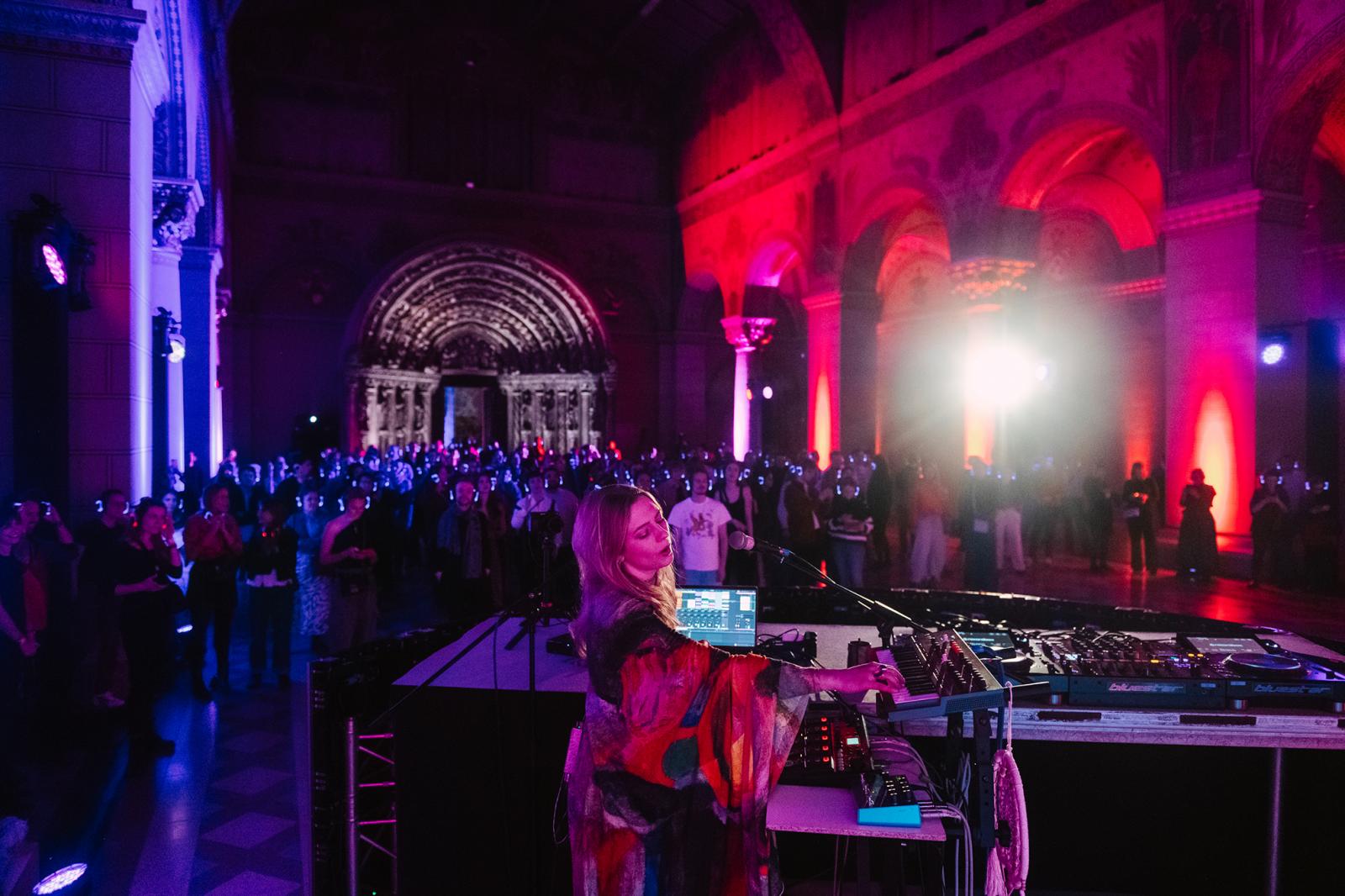 A Szépművészeti Múzeum reneszánsz, barokk és neoklasszicista tereiben a freskók alatt egy túlvilági vibrálásban sétálhattak a vendégek. A román kori kolostorok stílusát idéző csarnok vastag pillérei között kialakított táncparketten pedig a két DJ közötti párbajba kapcsolódhatott be bárki. Közben a falakon magnetikus hullámtextúrális fényfestés futott, így az ornamentika élő anyaggá vált a szemcse-szimulációs videóanimáció rétegeiben. Ilyen atmoszférában William Blake angyalai majdhogynem kiléptek egy táncra a képkereteikből.
