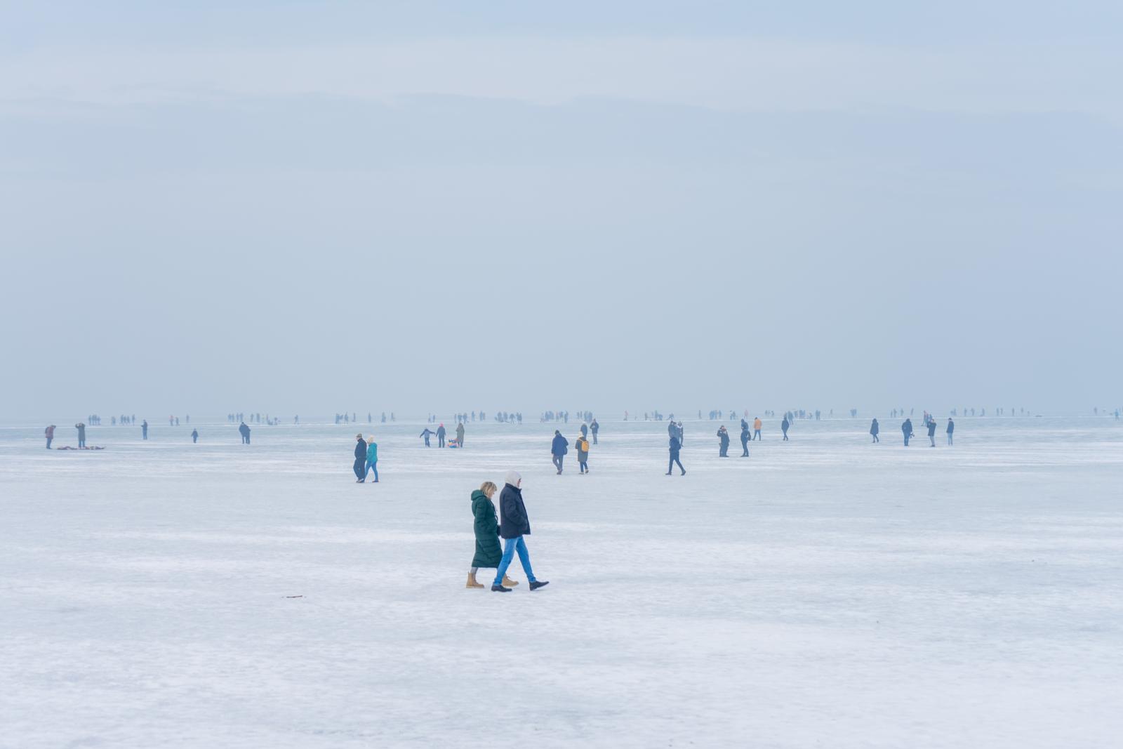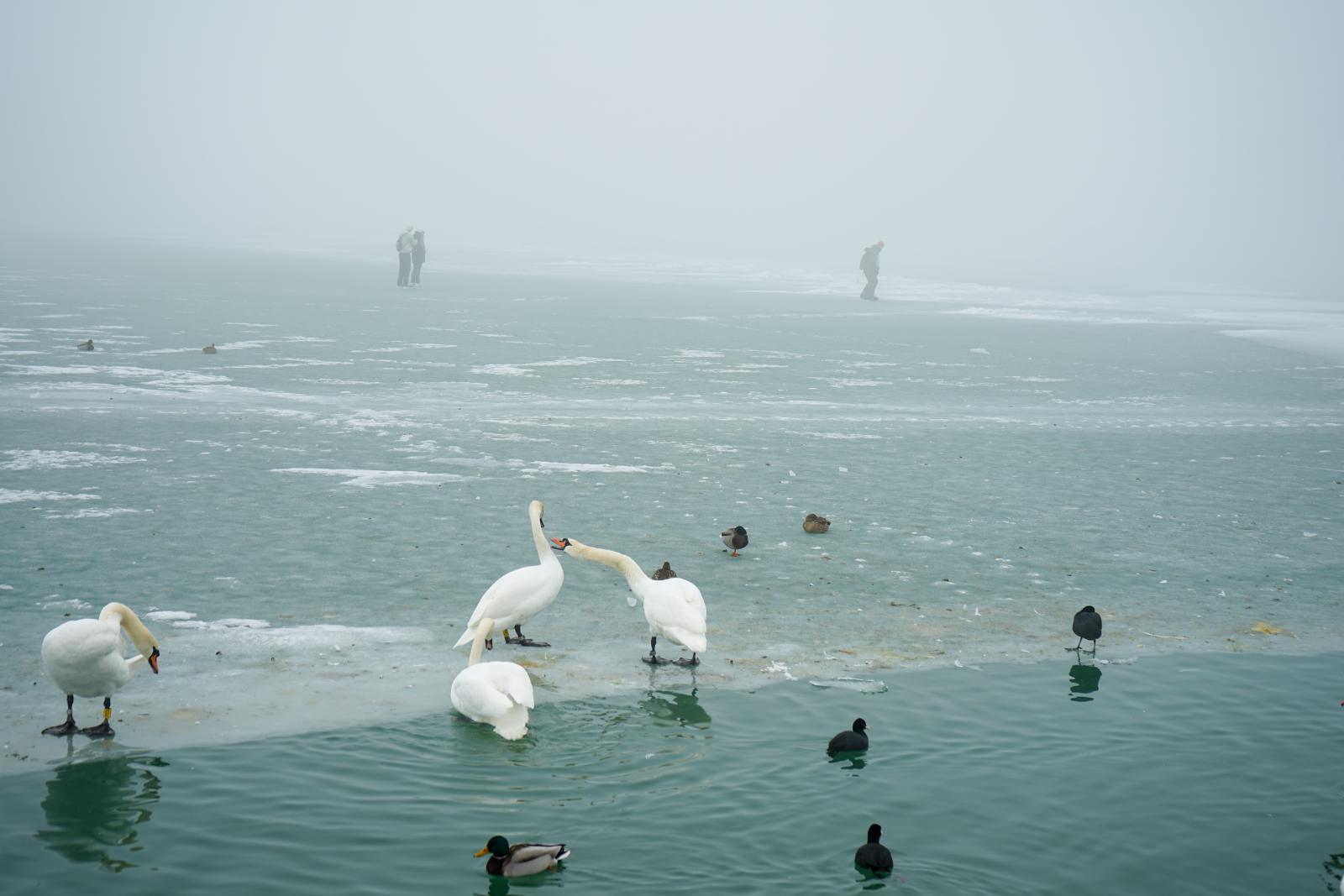 A köd felszállása után, a délutáni órákban vált igazán láthatóvá, hogy nemcsak a part közelében tartózkodtak emberek: a bólyák környékén is többen sétáltak a jégen. Munkatársunk csak a siófoki kikötő közelében több száz embert számolt meg.