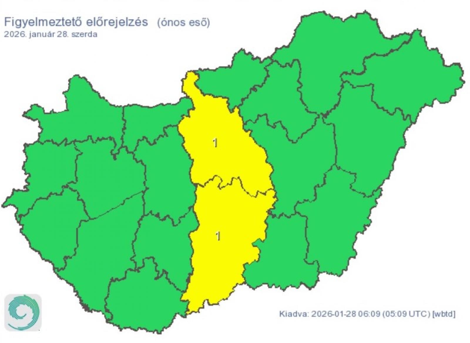 Reggelre a középső országrészben is mindenhol megnövekszik a felhőzet, napközben így erősen felhős vagy borult lesz az ég, és északkeleten tartósan ködös maradhat az idő. Egyre többfelé fordulhat elő kisebb eső, de az Északi-középhegység térségében havazásra és vegyes halmazállapotú csapadékra, átmeneti ónos esőre is számítani lehet. Borsod térségében és az Északi-középhegység hegyvidéki tájain néhány ceniméter friss hó hullhat. Estétől délnyugat felől kiterjedt csapadékzóna érkezik, melyből már északkeleten is túlnyomóan eső várható. Néhol megélénkülhet a délies, majd a keleties irányba forduló szél.