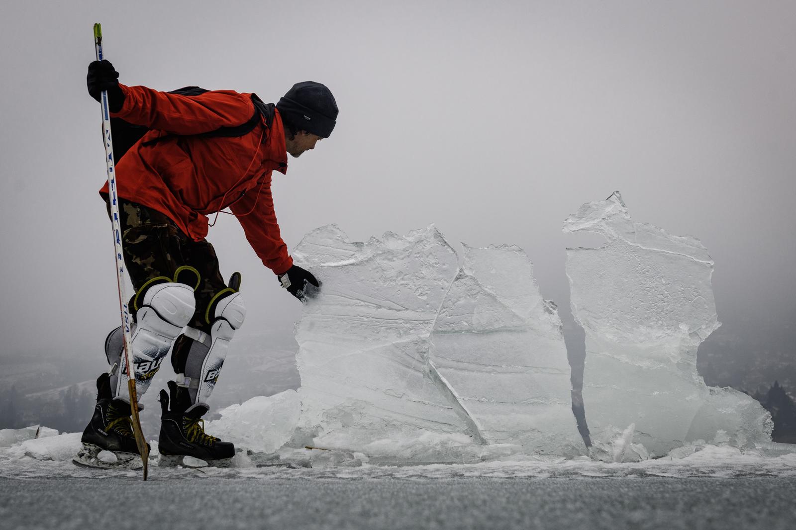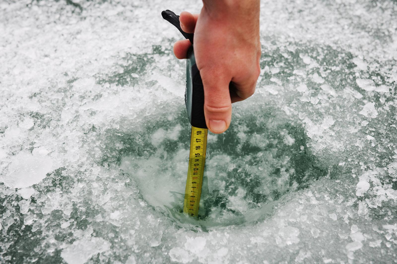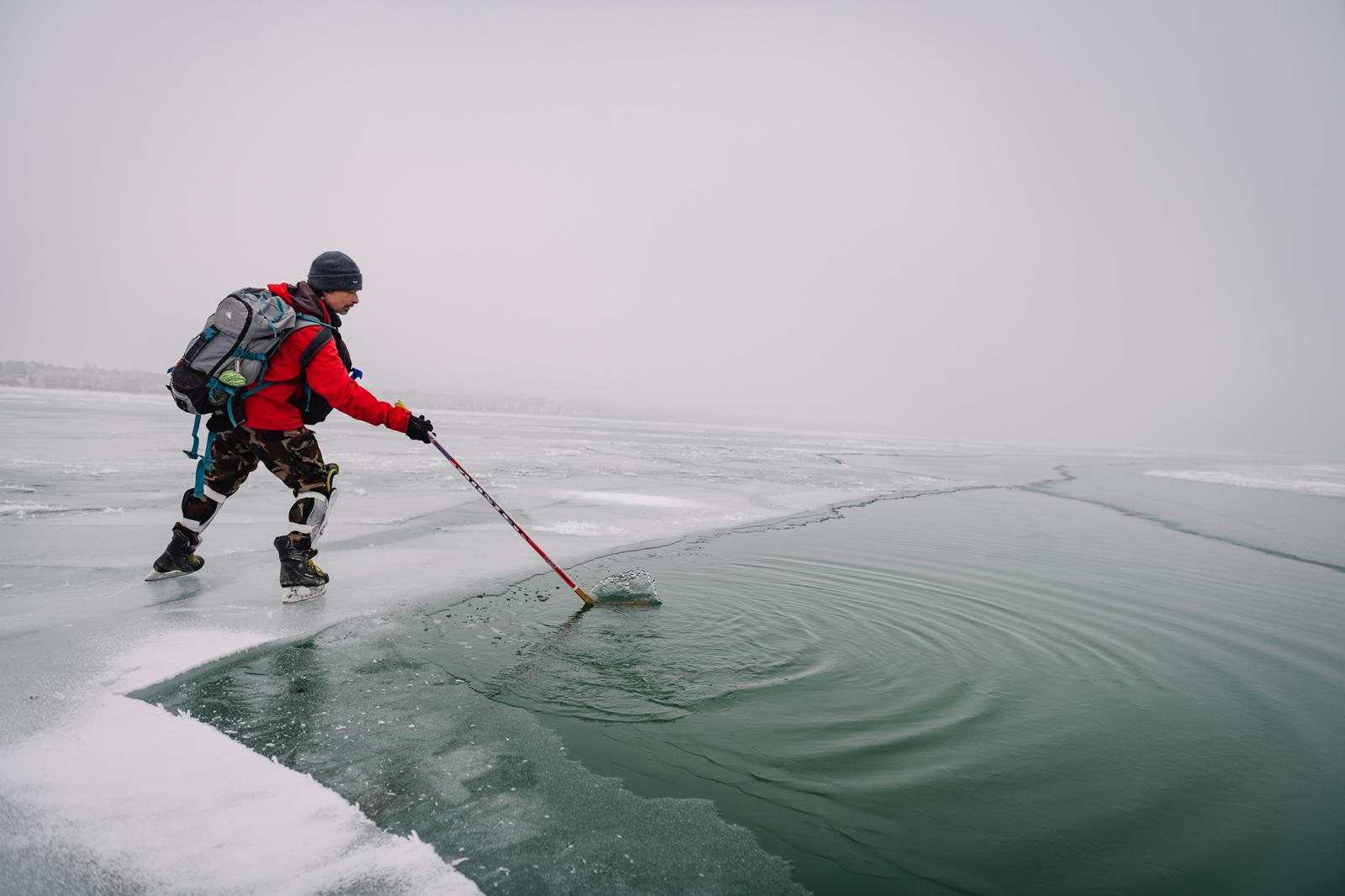 Alsóörsnél jött a legkritikusabb szakasz: egy rianás után csak 4 centis jégvastagságot mutatott a mérőszalag. Itt hallottuk meg először „a jég szavát”: a hokiütők kopogtatására válaszul különös, a delfinekre emlékeztető hangon felelt.