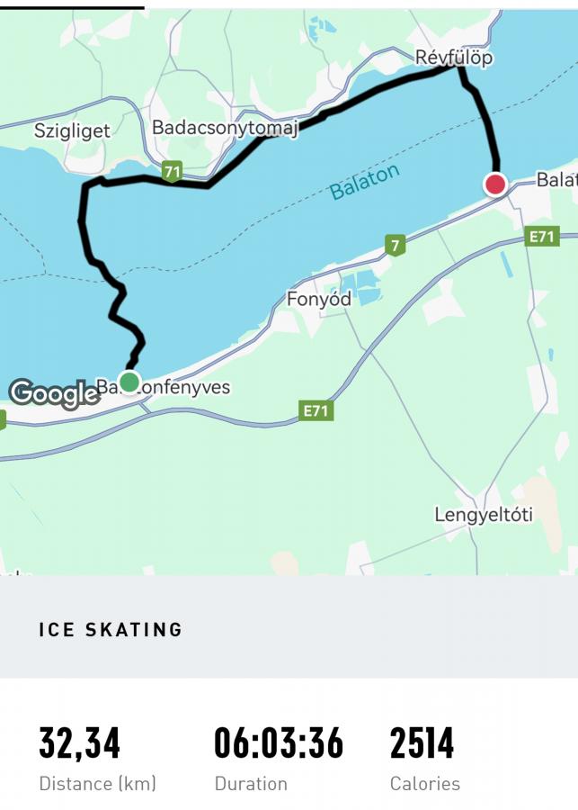 Siófok környékén egyenetlen jégfelület és széles rianás lassított minket. Egy szűkületnél átugrottuk a rianást, majd itt csatlakozott hozzánk Ádám, aki helyismeretével sokat segített. Hokiütőkkel vizsgáltuk a jeget, jégszöggel és kötéllel is készültünk – szerencsére egyszer sem volt rájuk szükség. A rianás után végre csoda szép tükörjég következett. Felgyorsultunk. Zamárdinál Tihany felé fordultunk, ahol a jégen ebédelve azt vettük észre, hogy az ételünk és a vizünk is majdnem megfagyott.