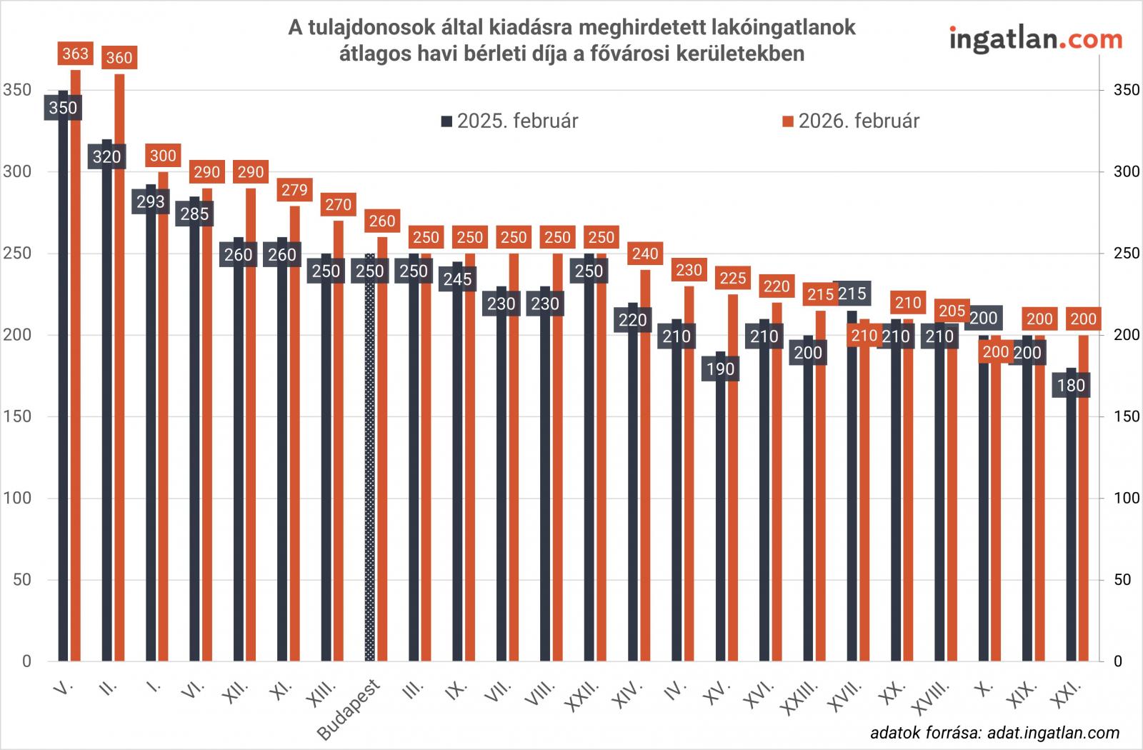 • az V. és a II. kerület továbbra is kiemelkedik mezőnyből a 362,5 ezer és 360 ezer forintos mediánnal,