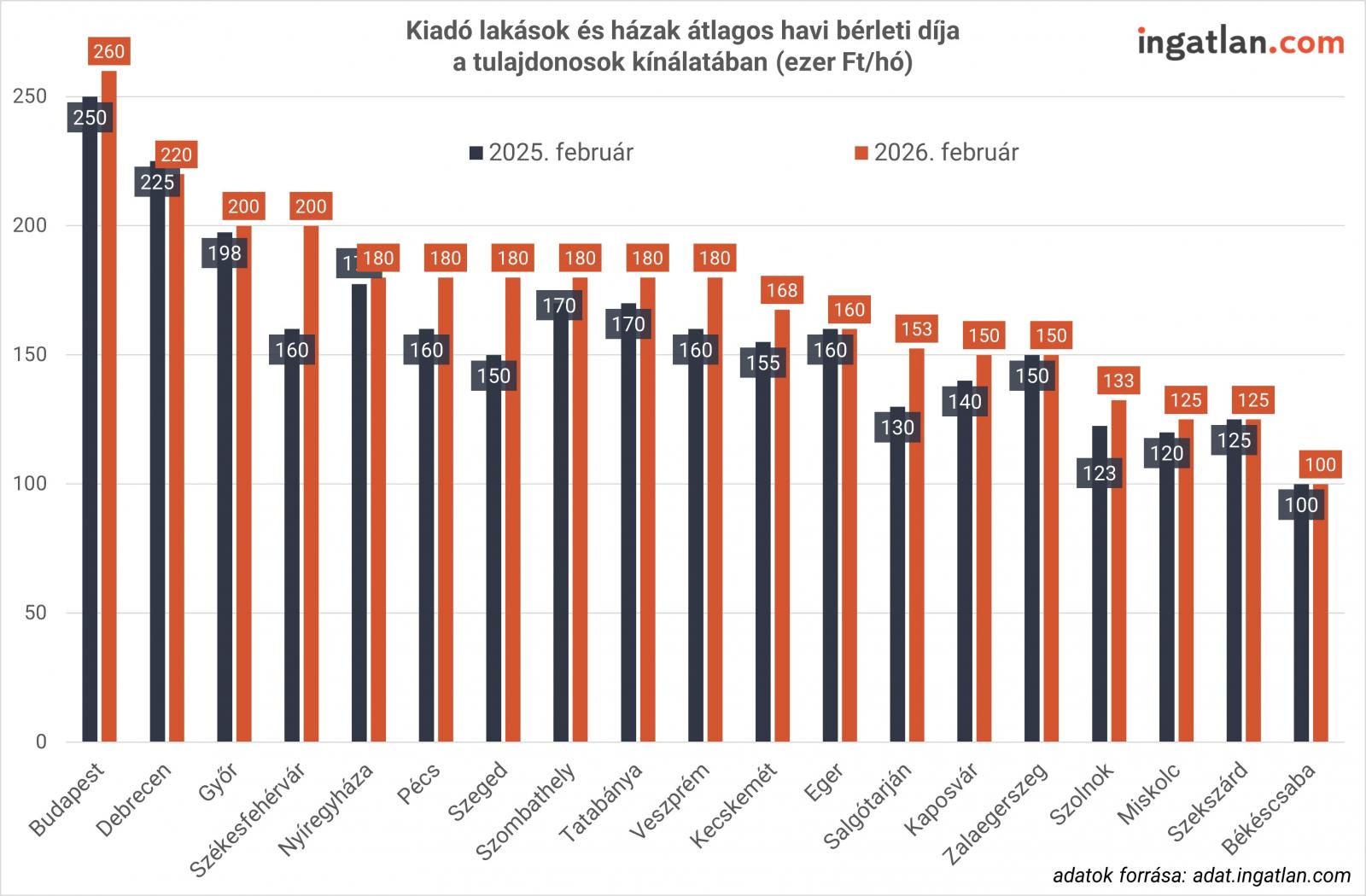 • míg számos vármegyeszékhelyen, Nyíregyházán, Pécsen, Szegeden, Szombathelyen, Tatabányán és Veszprémben 180 ezer forint lakbérek mediánja.