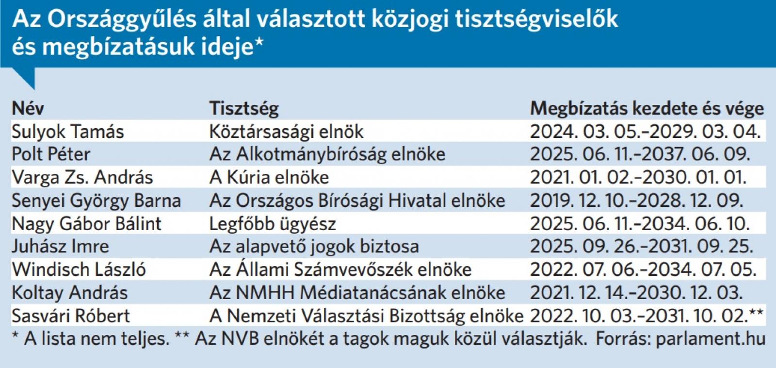 Orbán Viktor elárulta, hogy még 15 évre készül, de pont ez az, amit a többség már nem akarTétek és esélyek áprilisban – Már nem az a kérdés, hogy Orbán Viktor vagy Magyar Péter, hanem hogy van-e még visszaút a civilizációbaA Tisza Párt, illetve elnöke, Magyar Péter ezeknek a pénzeknek a hazahozatalát ígéri, ami a varsói Tusk-kormány példája alapján akár teljesíthető is lehet egy általános jogállamisági nyilatkozattal, illetve néhány törvény módosításával. Sokkal nehezebb dolga lesz hatalomra kerülve a Tiszának azokkal a közjogi tisztségviselőkkel, akiknek a mandátuma még több évig tart (lásd táblázatunkat). Kérdés, hogy ezek a kivétel nélkül a Fideszhez kötődő személyek egy új kormány esetében kihez lesznek lojálisak: a törvényekhez, vagy a megbízójukhoz? Magyar Péter a 444-nek a múlt héten erről azt mondta: hisz abban, hogy ha a megválasztott miniszterelnök leül a köztársasági elnökkel, az Alkotmánybíróság elnökével, a többi kétharmados többséggel bebetonozott Orbán-janicsárral, akkor meg fogják érteni az idők szavát. Ugyanebben az interjúban úgy fogalmazott: – Nagyon fontos elmondani, hogy jogállamot nem lehet jogállamellenes lépésekkel visszaépíteni. Voltak az előző választásnál olyan ötletek, hogy mindenféle feles többséggel hogyan írjuk felül a kétharmados vagy a sarkalatos törvényeket meg az alaptörvényt. Ezt én nem tartom egy jó útnak.