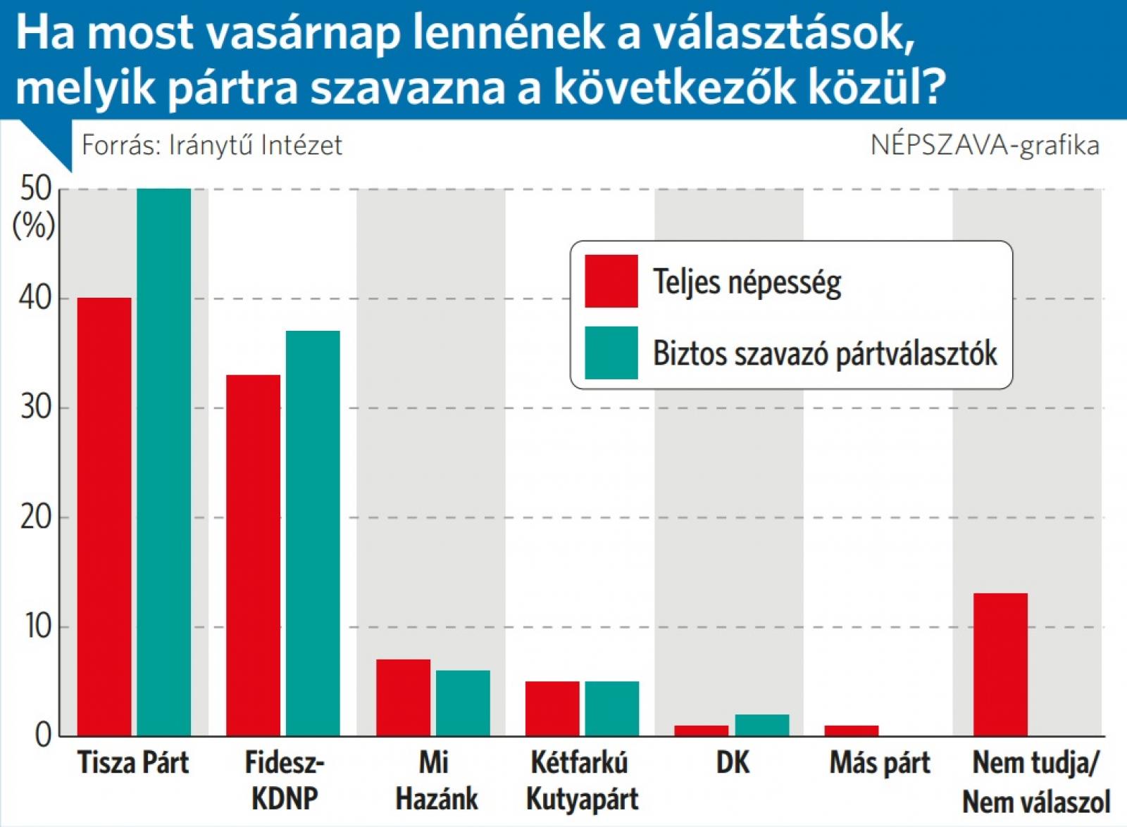 A reprezentatív felmérés szerint a teljes népesség 40 százaléka a Tiszát, 33 pedig a kormánypártokat támogatná áprilisban. A pártot választani tudó biztos szavazók körében még nagyobb a különbség; itt 50-37 az állás Magyar Péter politikai alakulata javára.