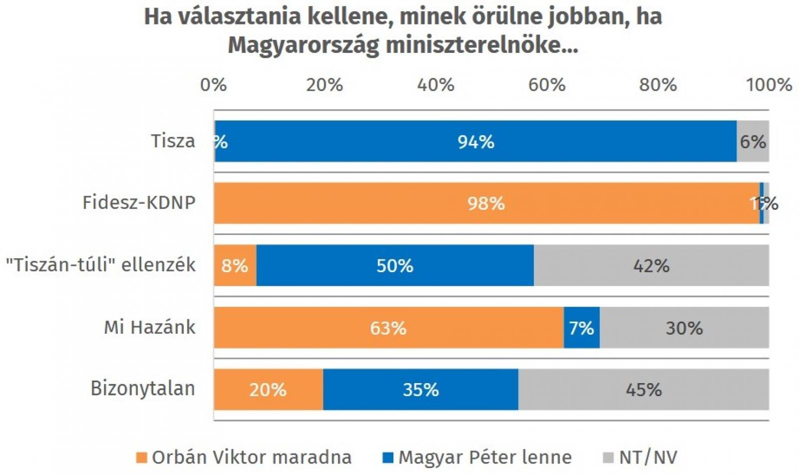 a két nagy párt tábora hűséges, a Tisza Párt szavazóinak 94 százaléka szeretné, hogy Magyar Péter legyen a miniszterelnök, a Fidesz-KDNP-sek 98 százaléka szeretné, ha Orbán Viktor megtartaná pozícióját.