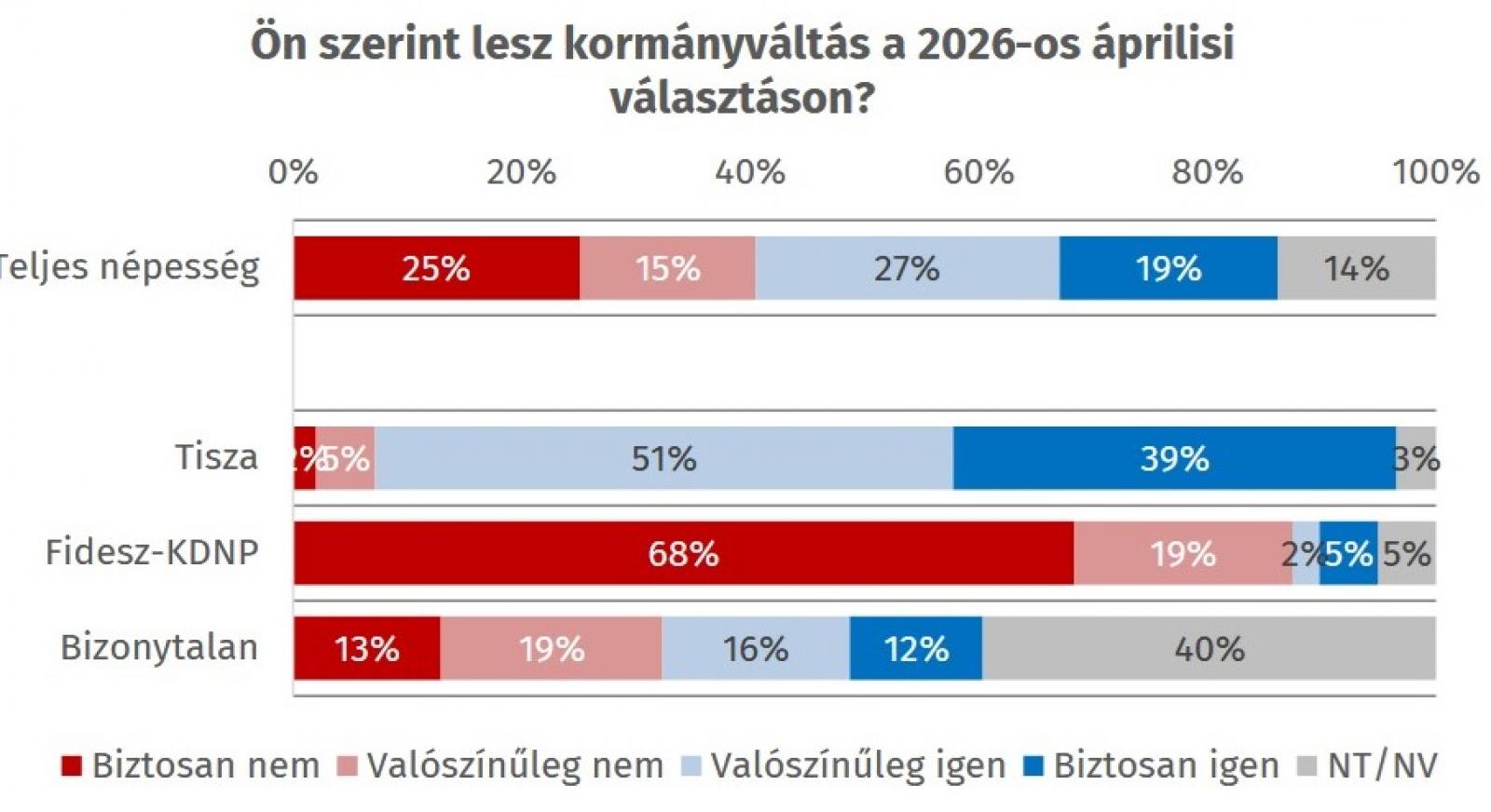 A válaszadók 46 százaléka szerint kormányváltást eredményez a 2026-os választás, 40 százalék pedig újabb Fidesz-KDNP győzelemre számít. Csak 19 százalék biztos abban, hogy változás jön, míg az összes kérdezett egynegyede biztos a Fidesz újabb győzelmében. A pártpreferenciákban vezet a Tisza, és mostanra a többség el is hiszi, hogy áprilisban Magyarék kormányt váltanak, bár a Fideszre fogadó válaszadók magabiztosabbak.